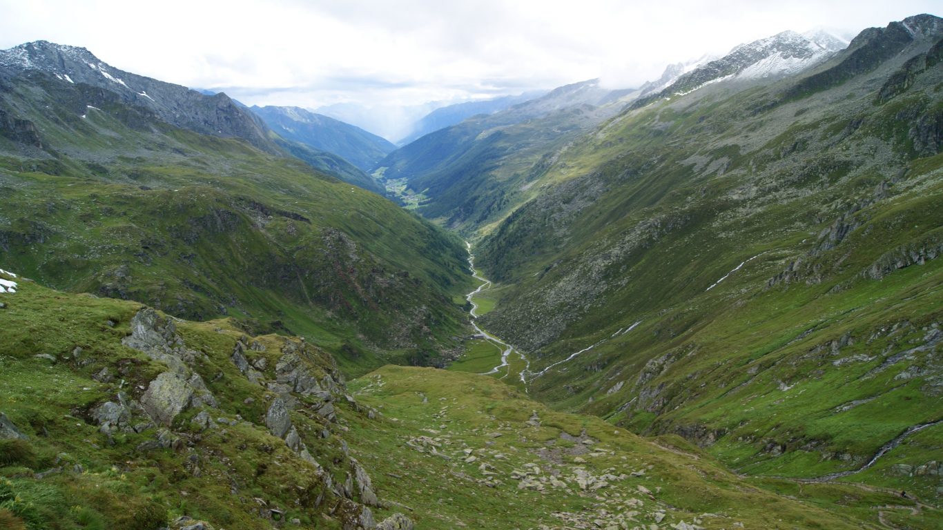 Description: A valley with a river running through it and mountains in the background with clouds in the sky above it.