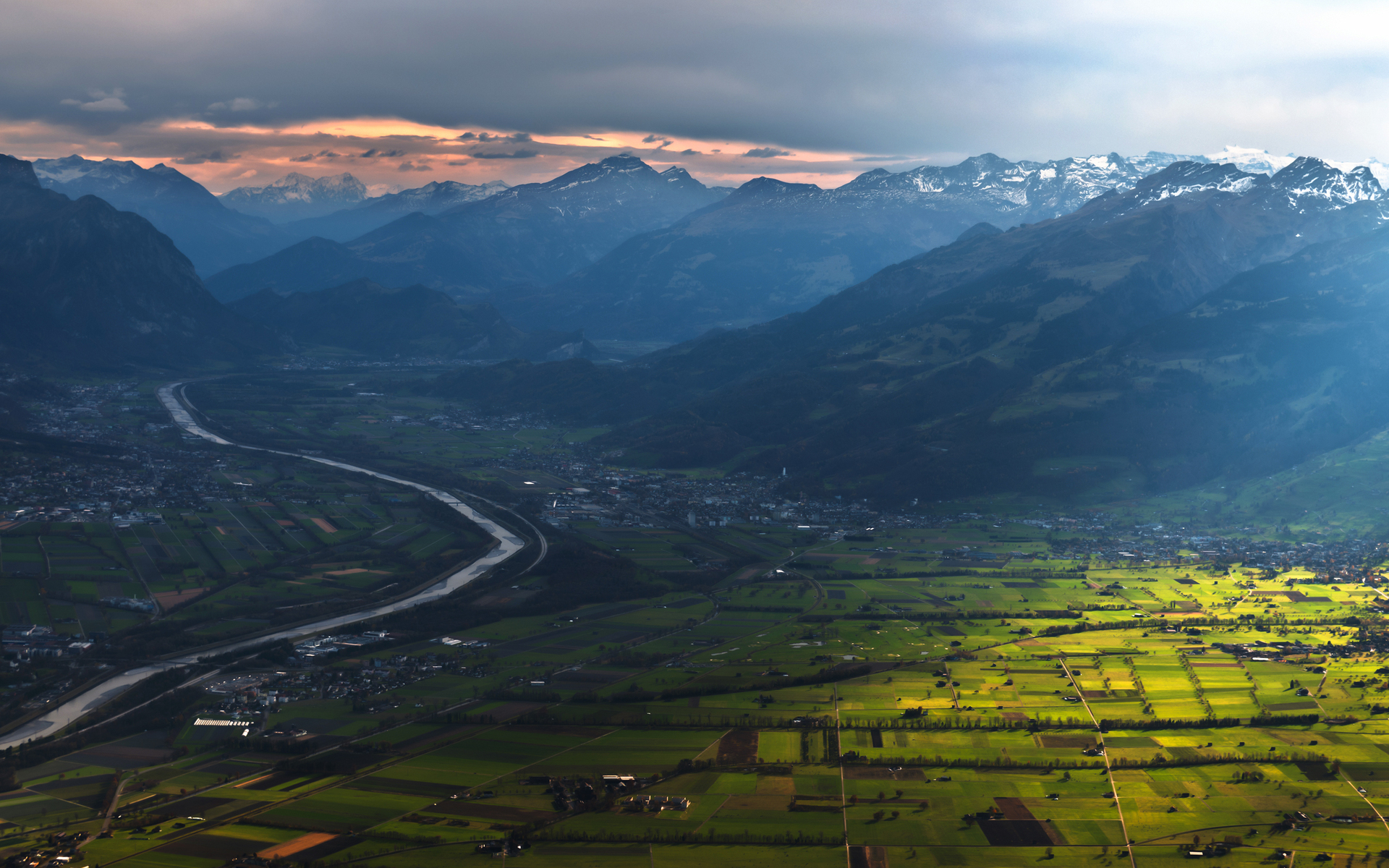 Description: A view of a valley with a river running through it and mountains in the background with a sunset in the sky.