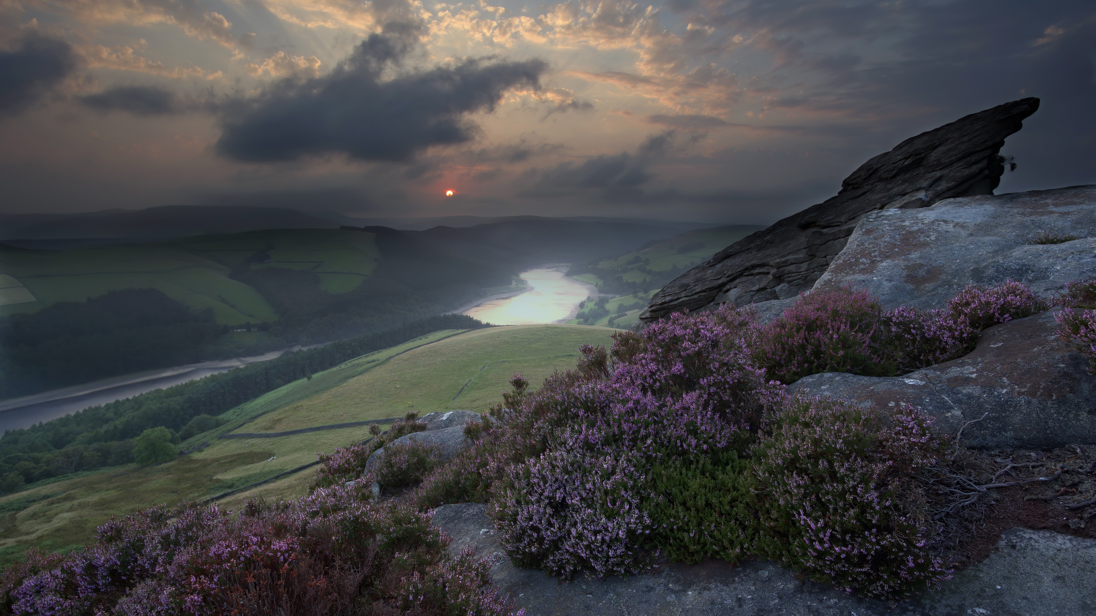 Description: A view of a valley and a river from a hill top at sunset with a cloudy sky and sun peeking through the clouds.