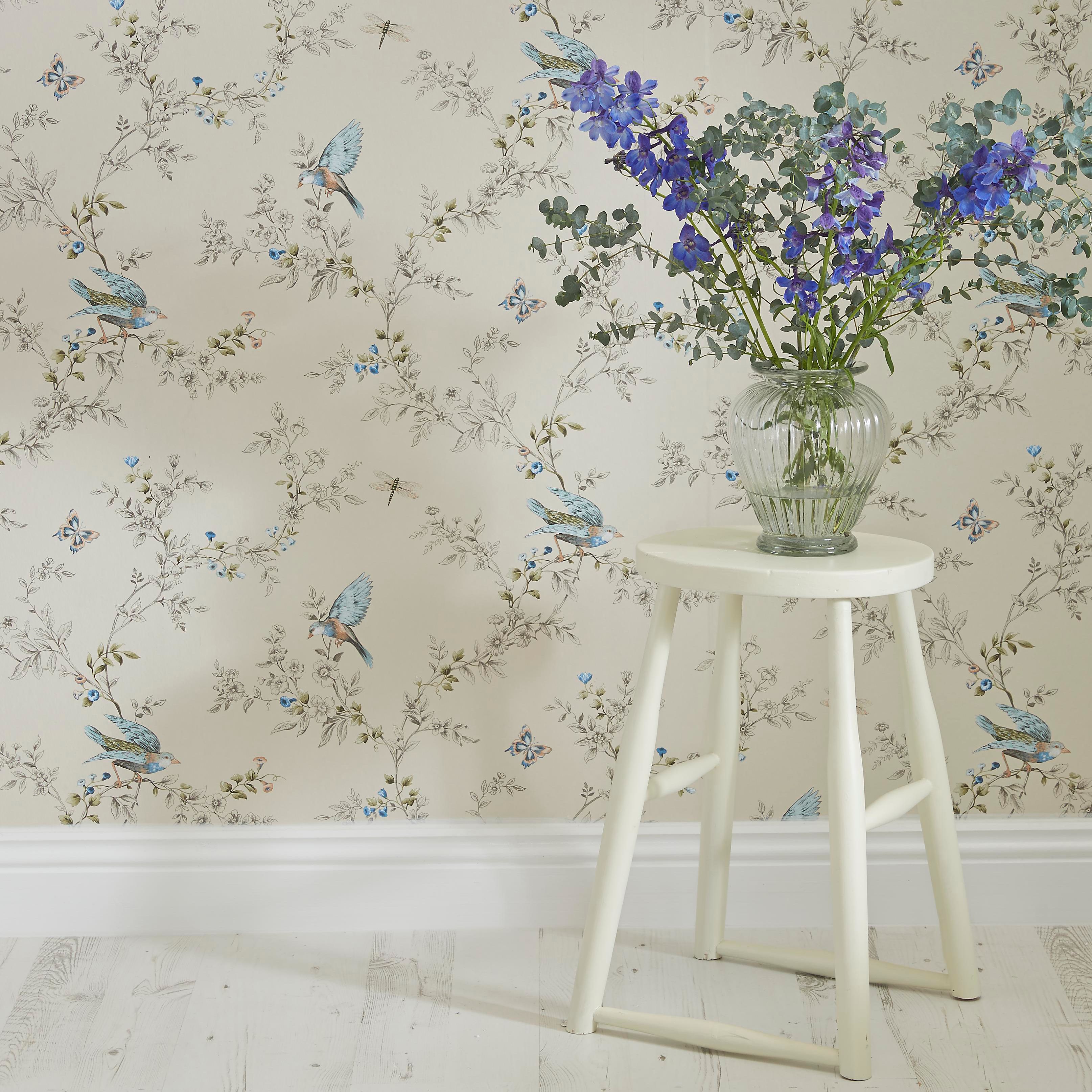 Description: A vase with blue flowers on a white stool in front of a wallpapered wall with a bird design.