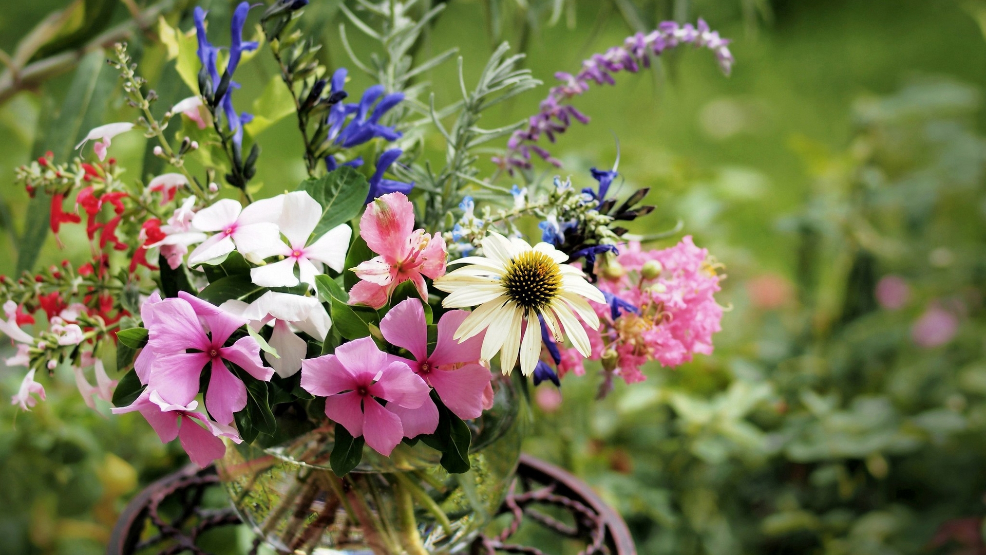 Description: A vase filled with lots of different colored flowers in a field of grass and flowers in the background.
