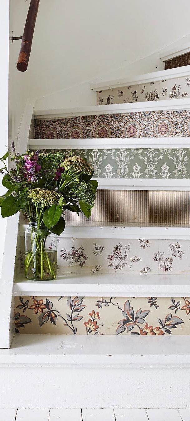 Description: A vase with flowers on a set of stairs with wallpaper on the wall behind it and a vase with flowers on the steps.