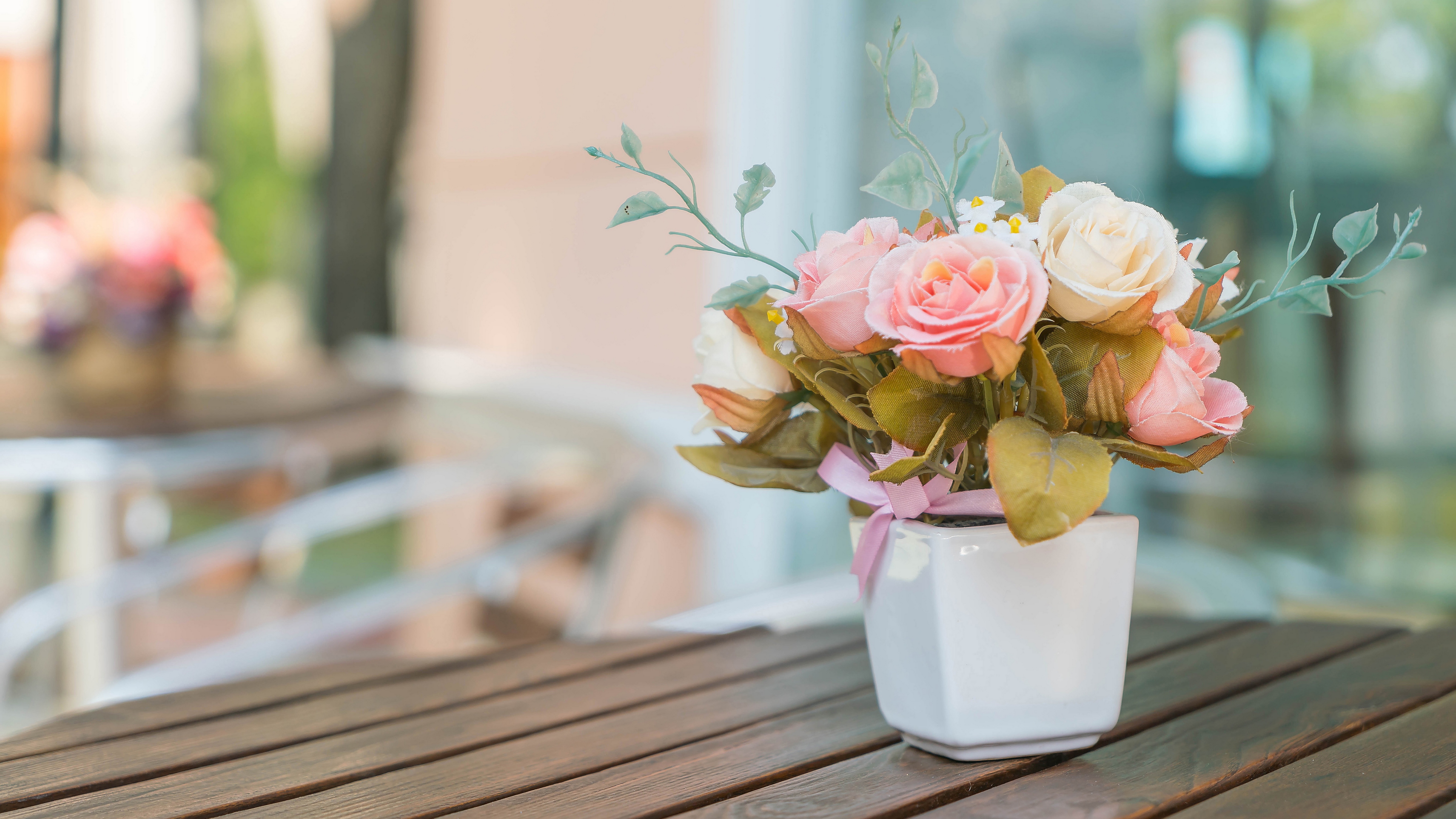 Description: A vase with flowers on a wooden table outside a building with a glass door in the background and a wooden table with a wooden table and white chair.
