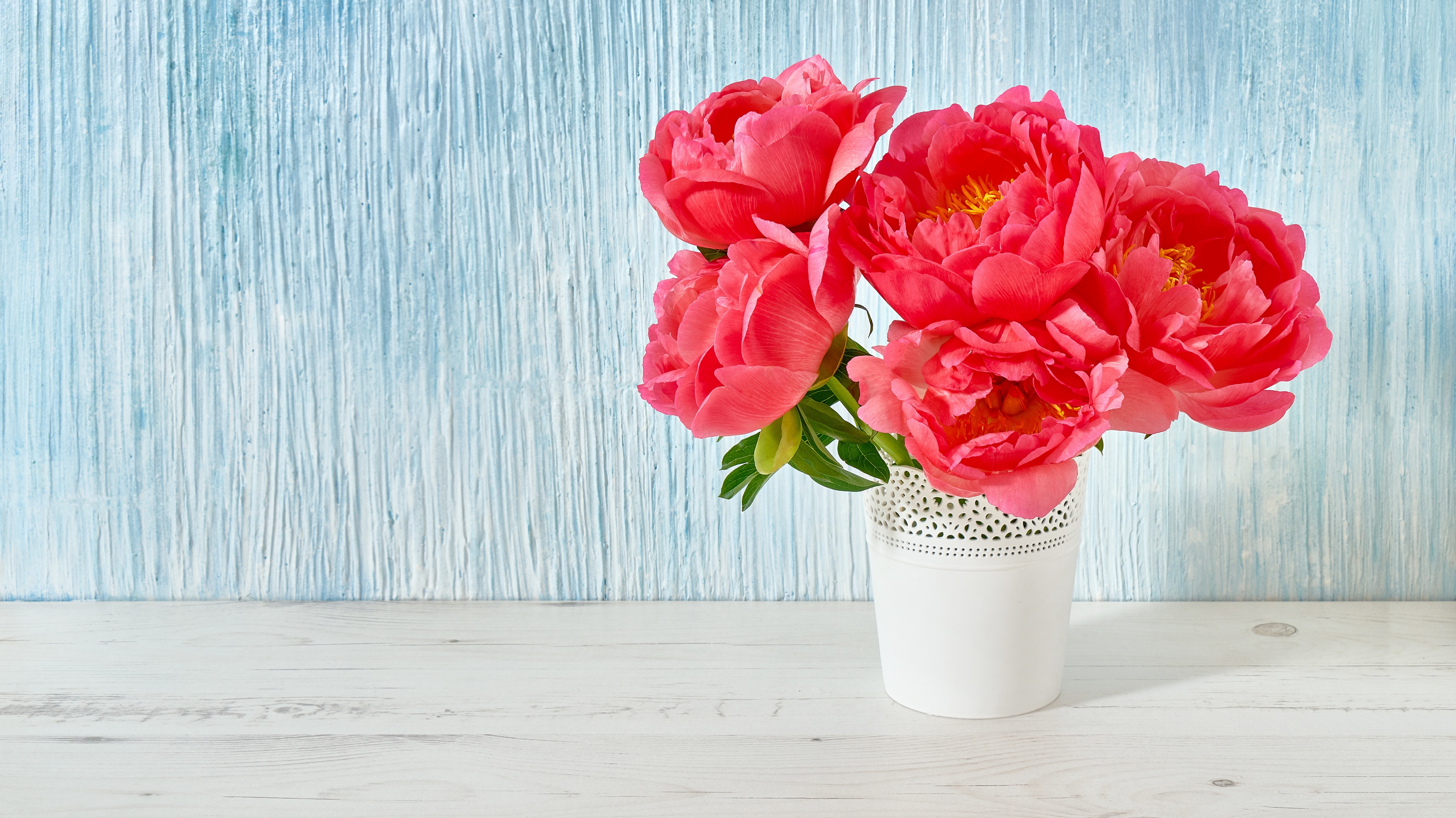 Description: A vase with pink flowers on a table in front of a blue wall and a wooden wall behind it.