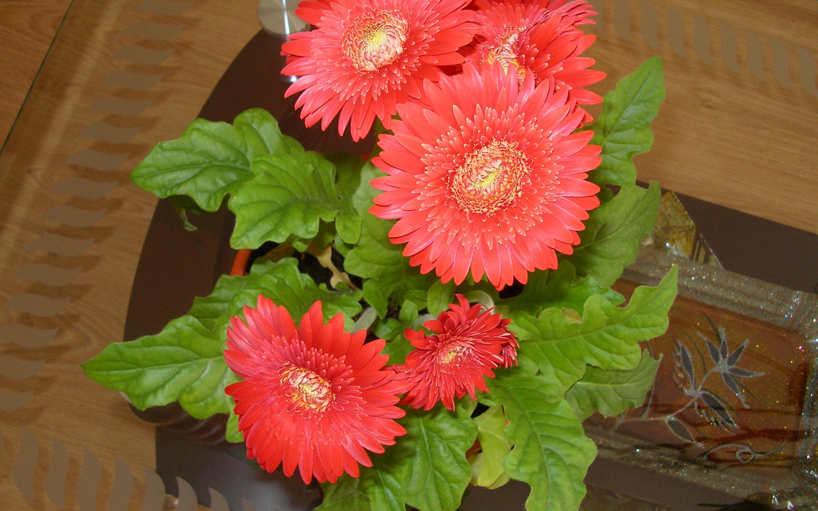 Description: A vase filled with red flowers on top of a table next to a mirror and a vase with green leaves.