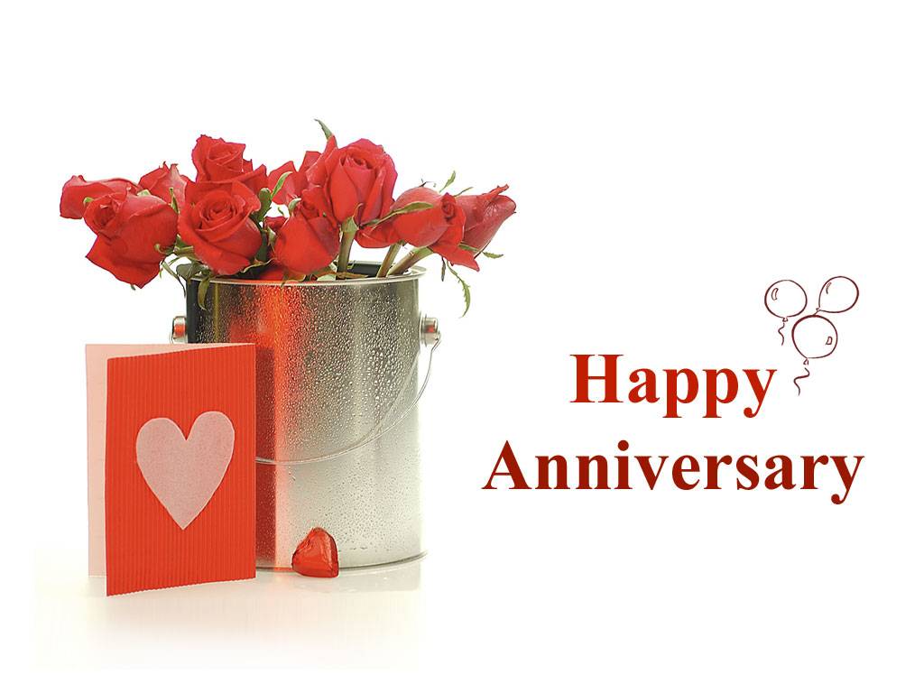 Description: A vase of roses with a card in it and a heart on the side of the card that says happy anniversary.