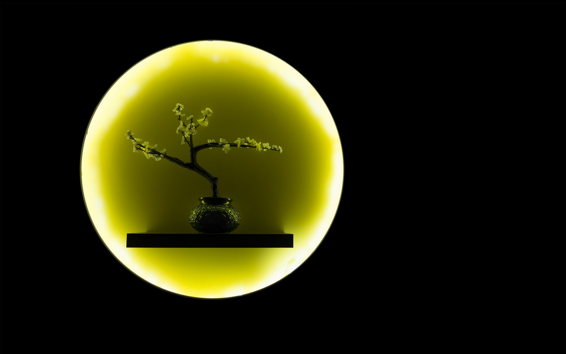 Description: A vase with a small tree in it on a shelf in front of a black background with a yellow circle.