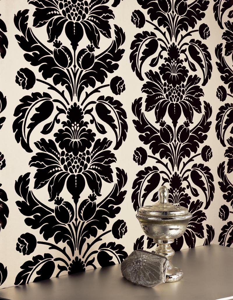 Description: A vase sitting on a table in front of a wallpapered wall with a black and white design.