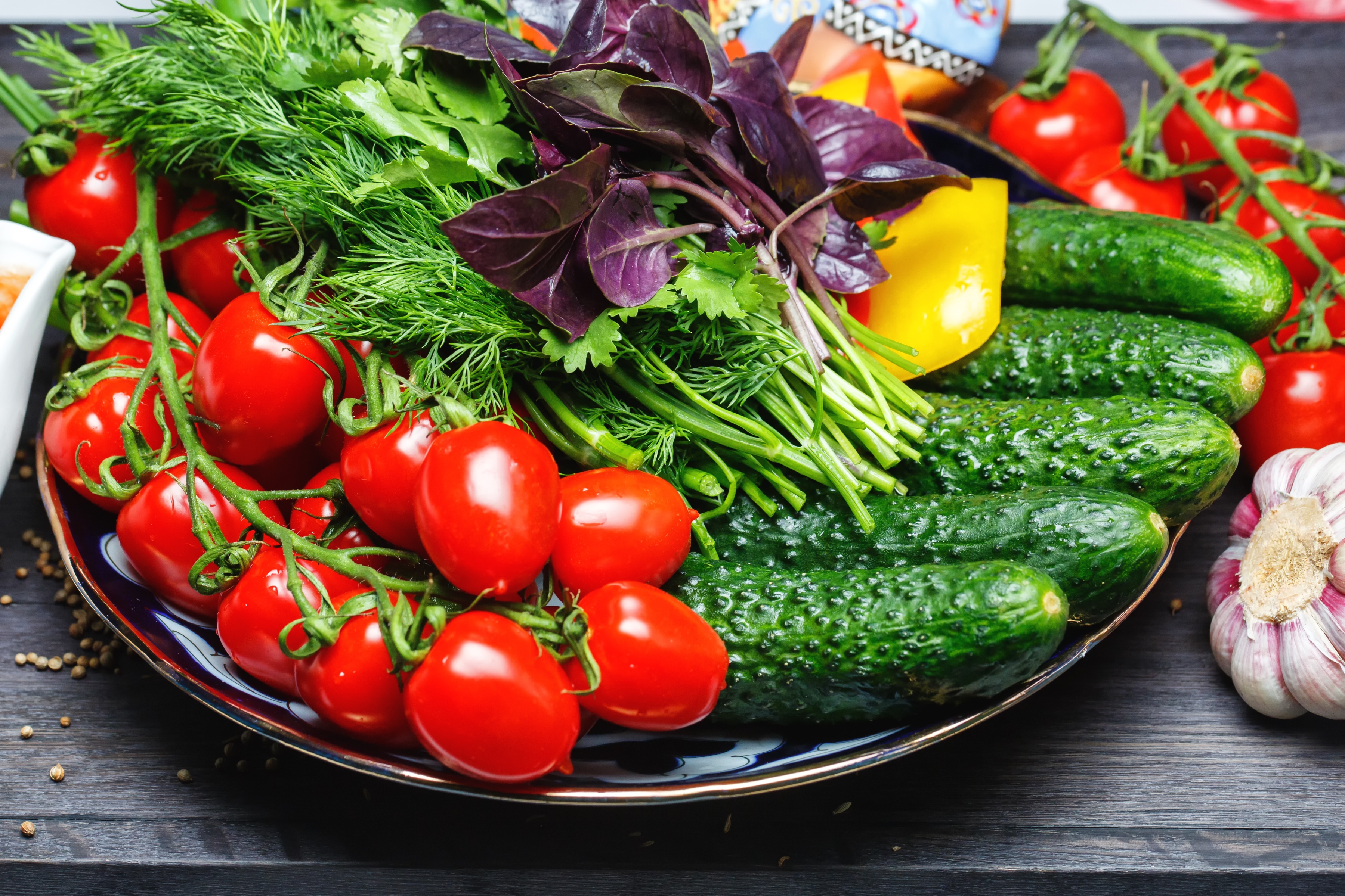 Description: A plate of vegetables and garlic on a table with garlic and tomatoes on it and a garlic and pepper packet.