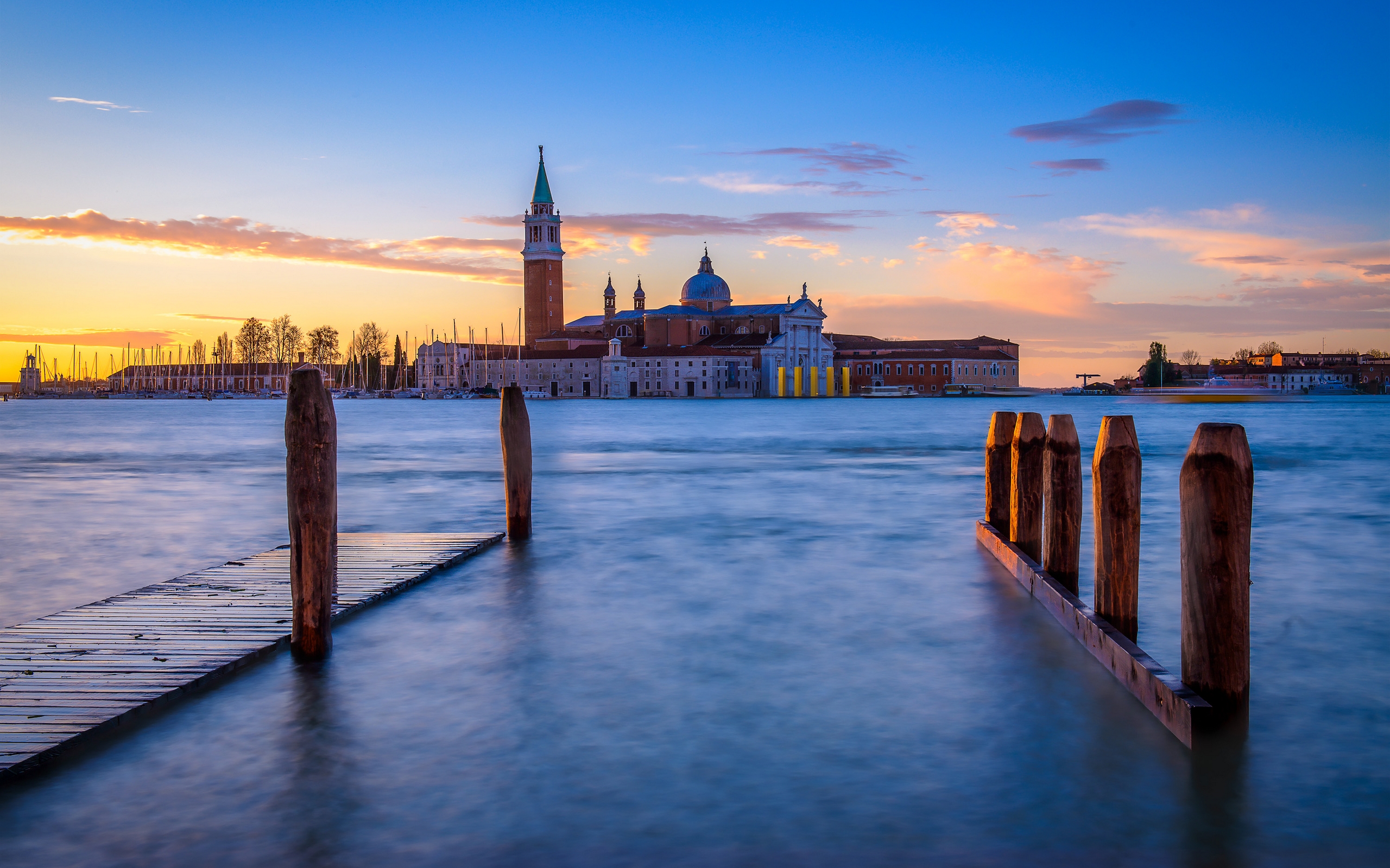 Description: A pier with a clock tower in the background at sunset or dawn in venice.