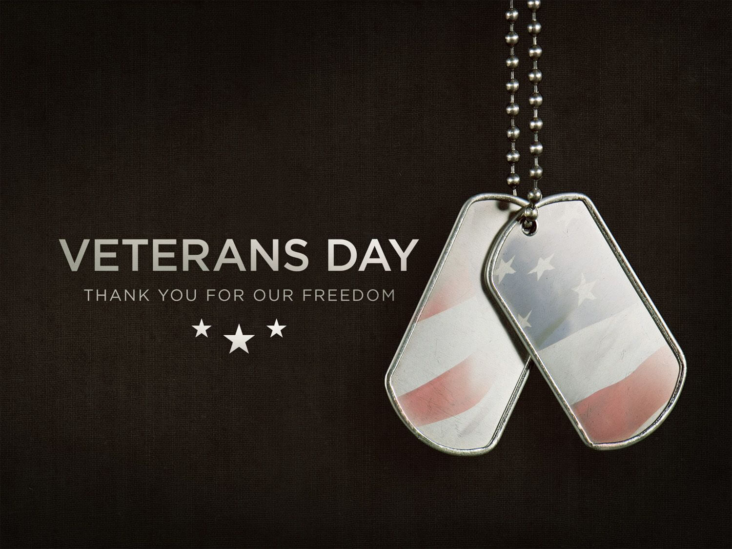 Description: Two dog tags with the words veterans day written on them hanging from a chain with a black background and stars.