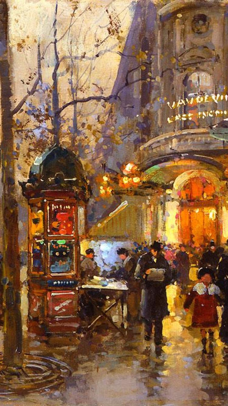 Description: A painting of a street scene with a trolley and people walking by it and a building with a sign that says.