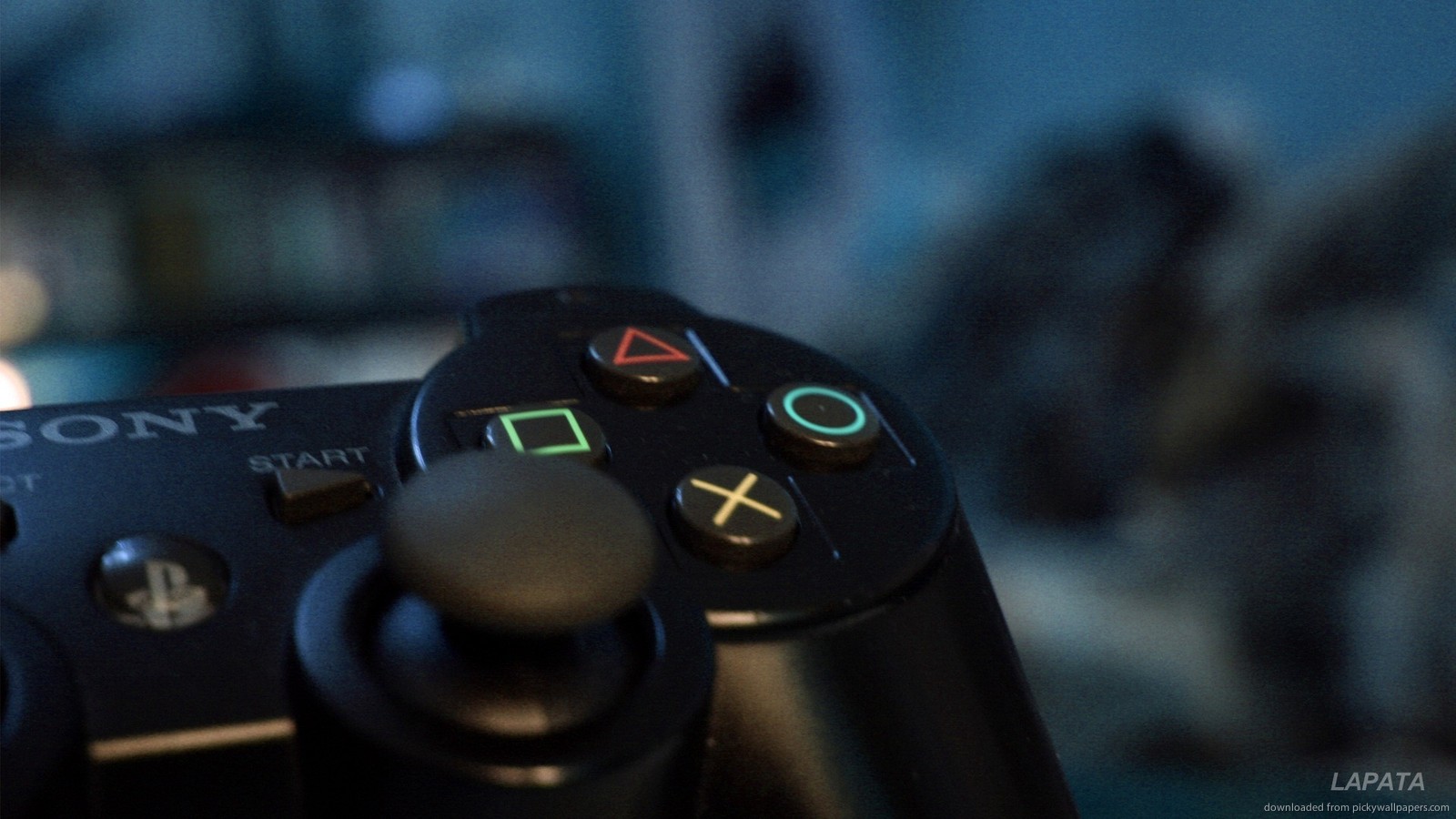 Description: A close up of a video game controller with a blurry background of a book shelf in the background.