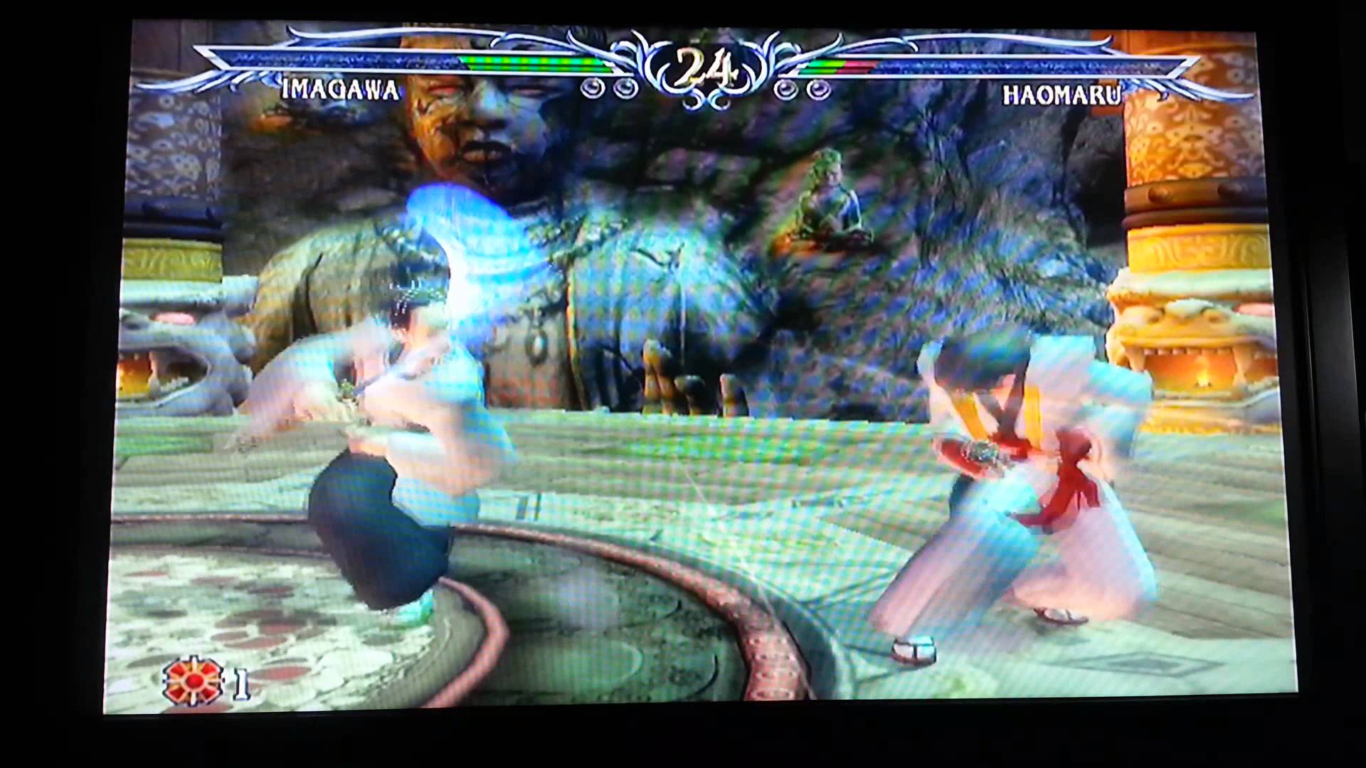 Description: A video game with two people playing a game on a tv screen with a man and woman in the background.