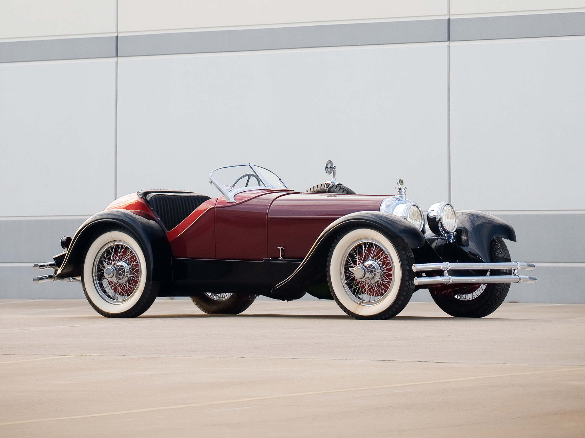 Description: A vintage car parked in front of a building with a large wall behind it and a building behind it.