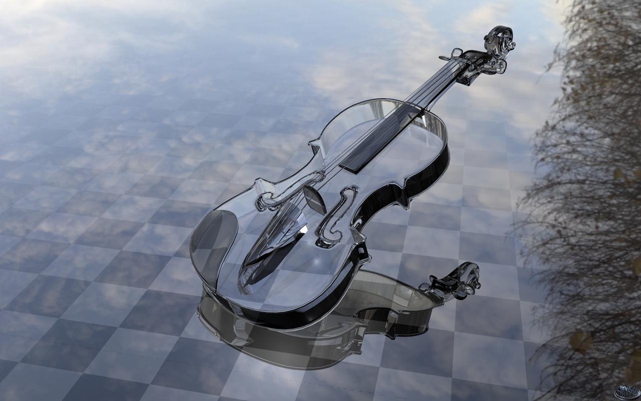 Description: A violin is shown on a checkered surface with a reflection of trees in the water behind it and a tree in the background.
