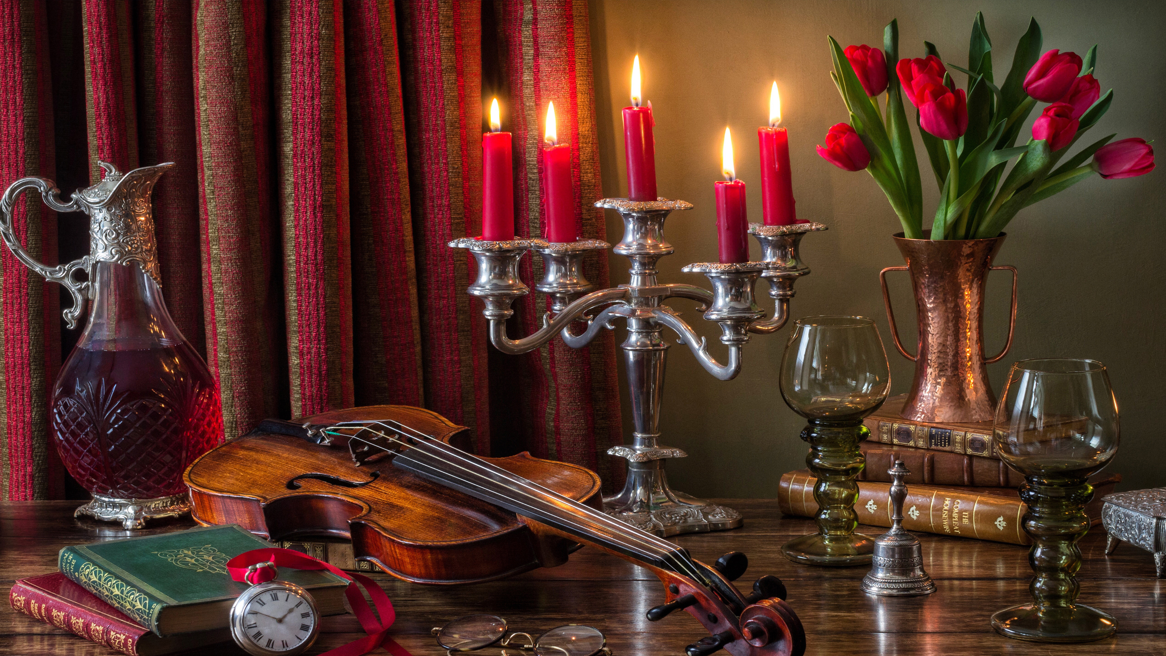 Violin vase flowers clock candle - free wallpaper for desktop | 5desktop.com