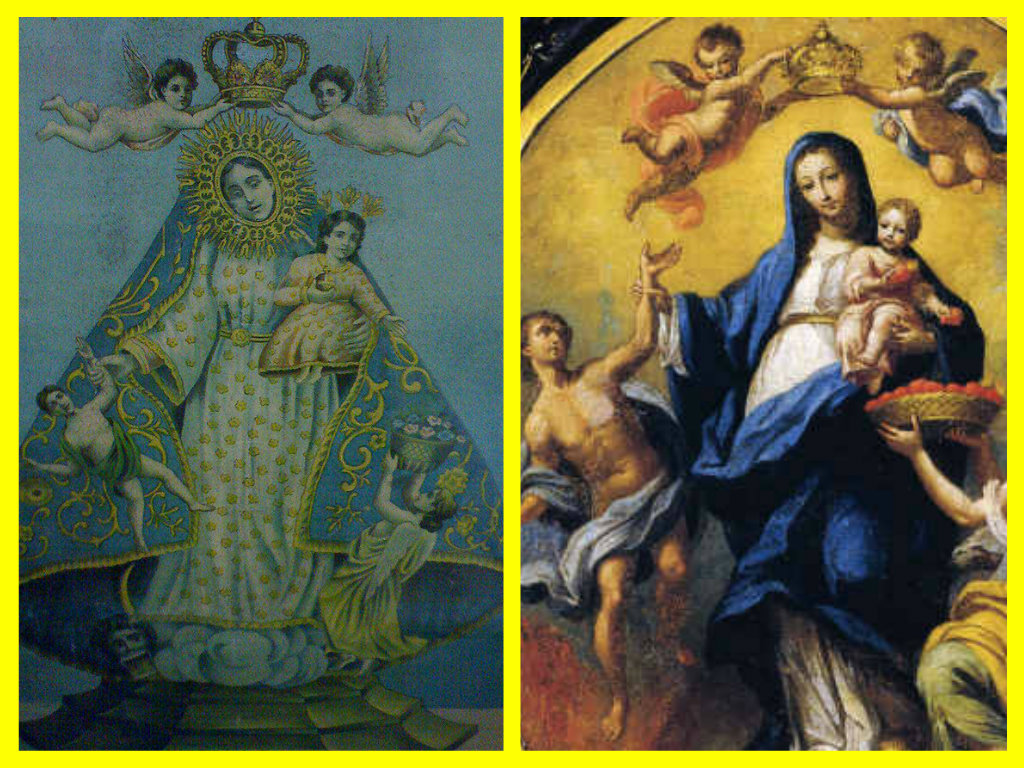 Description: A painting of a virgin mary and a painting of a child jesus with angels above her and below it.