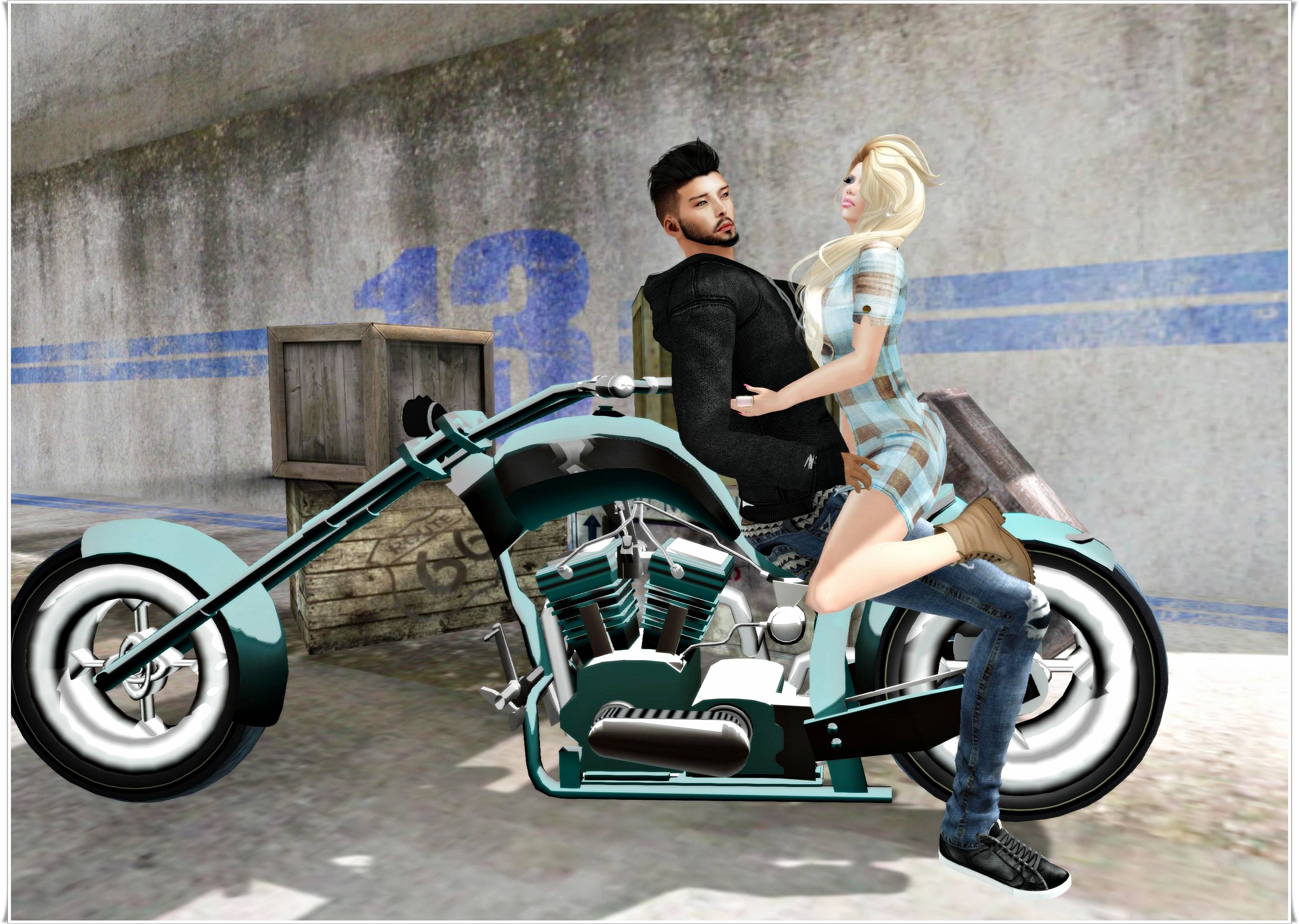 Description: A man and a woman are riding a motorcycle together in a virtual world environment with a blue motorcycle and a woman in a dress.