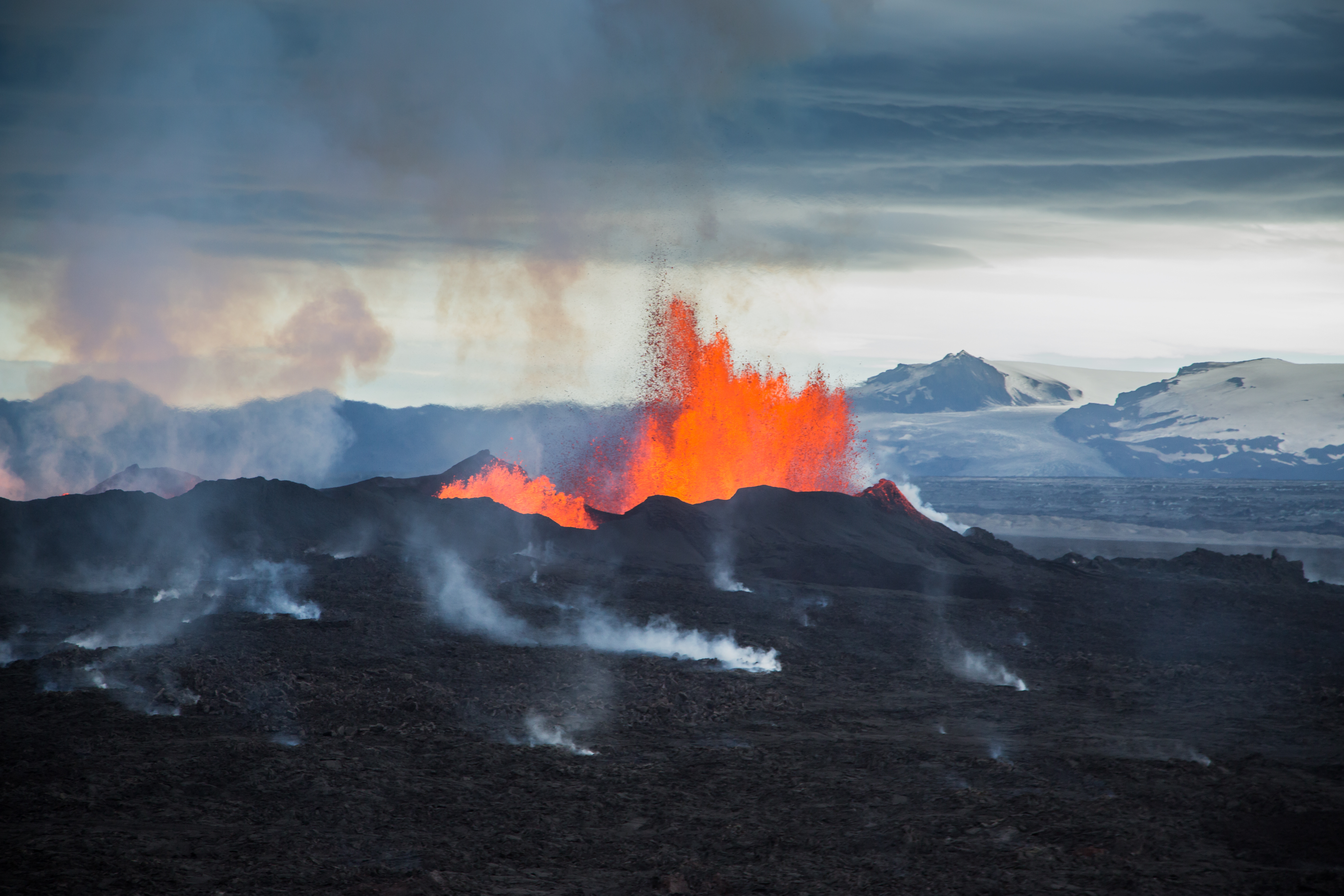 Description: A volcano spewing lava into the sky with mountains in the background and clouds in the sky above.