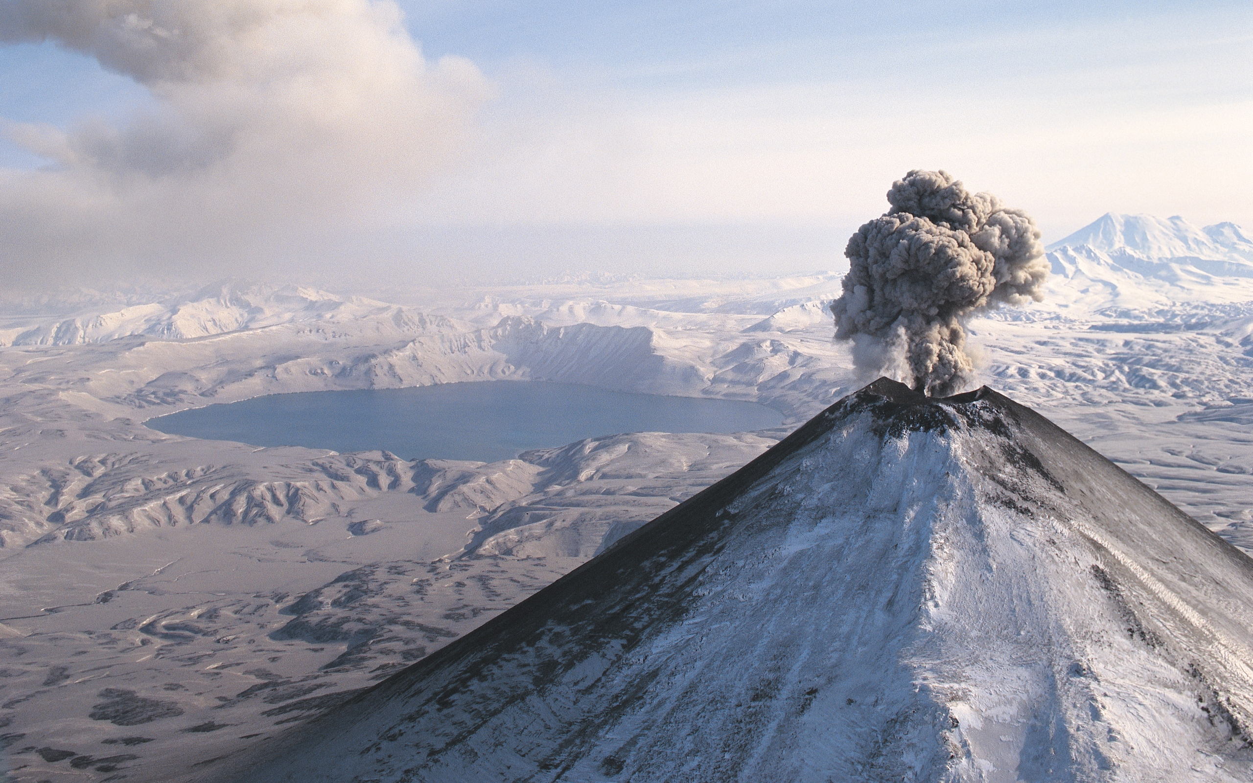 Description: A plume of smoke is rising from a volcano in the sky above a mountain range with a lake below.
