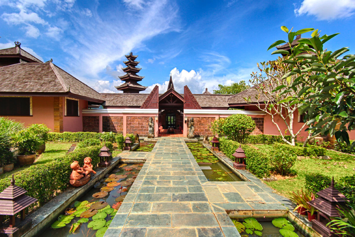 Description: A walkway leads to a building with a pond in the middle of it and a pagoda in the background.
