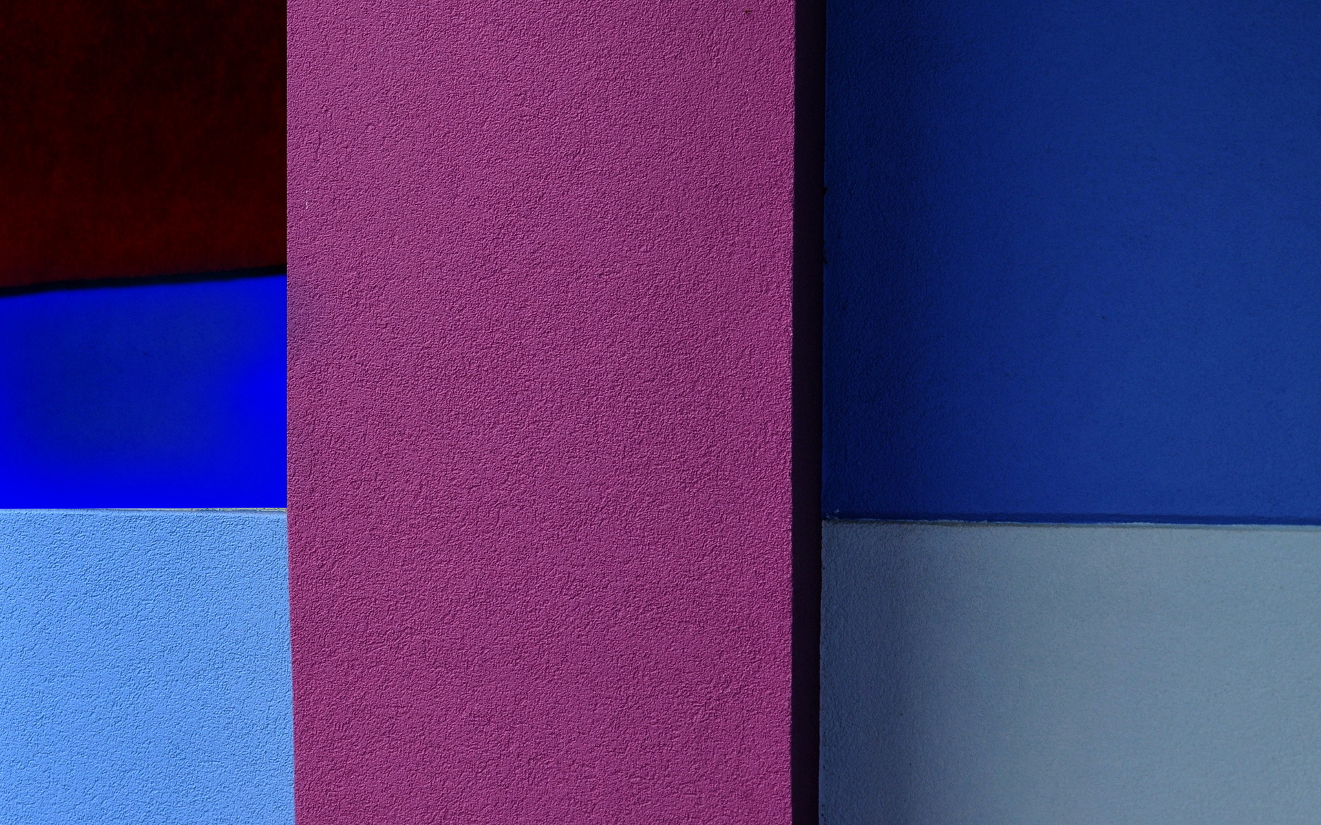 Description: A close up of a wall with a clock on it's side and a blue and pink wall.