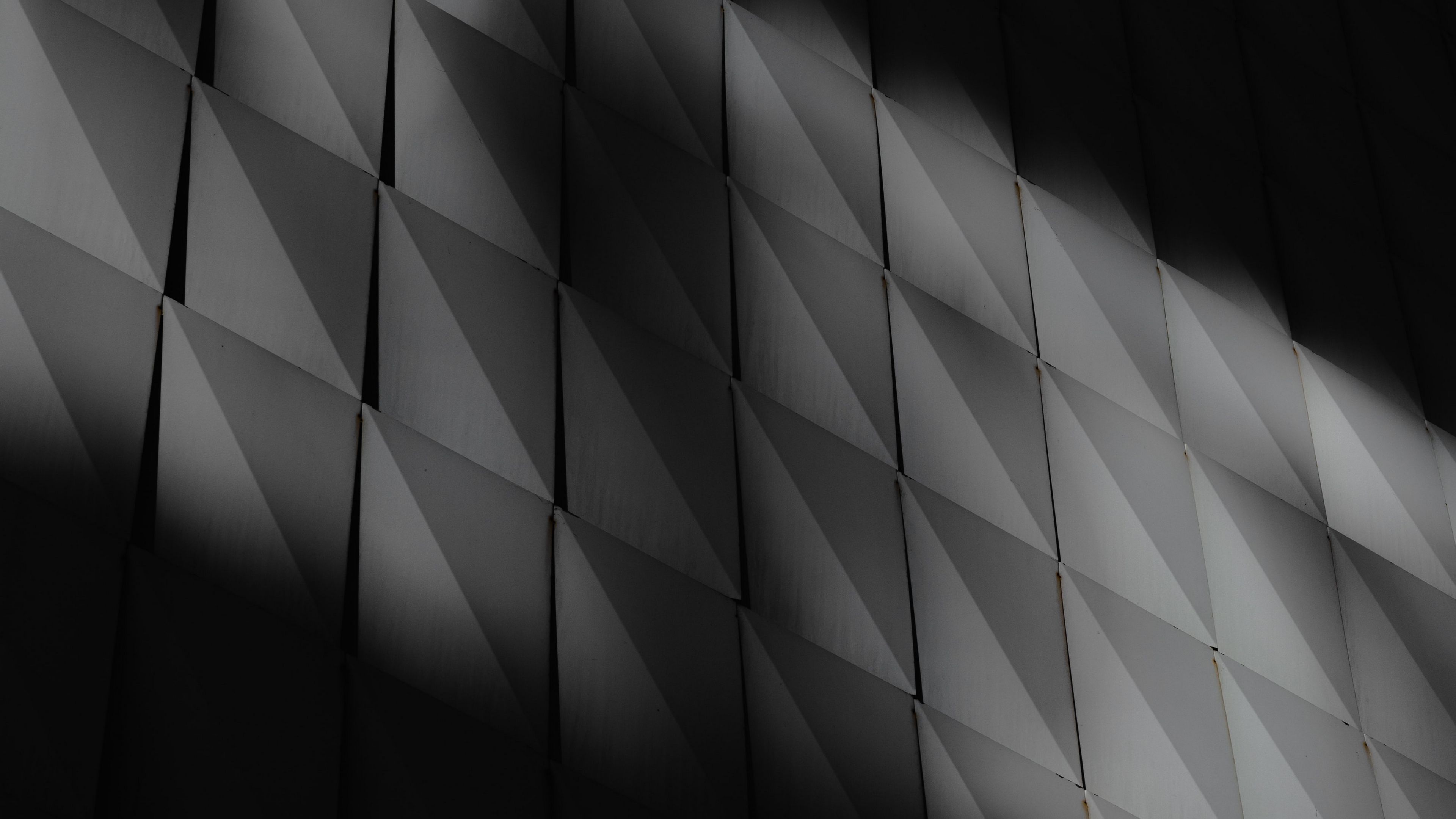 Description: A wall with a pattern of small squares on it's side and a light shining through the window.