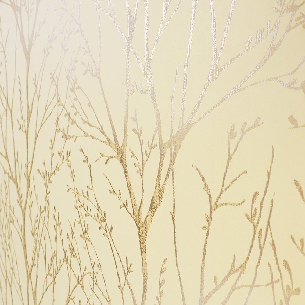 Description: A wall with a tree pattern on it and a vase with a flower in it next to a wall with a tree pattern on it.