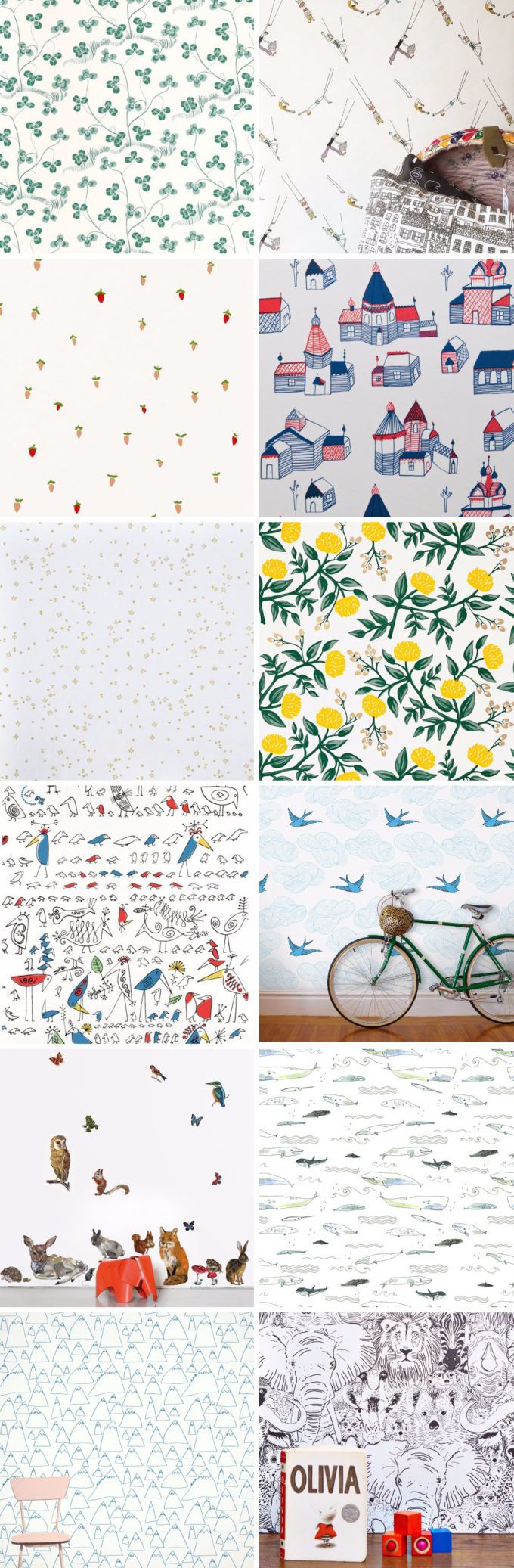 Description: A series of four pictures of different wallpapers and a chair and a table with a cup of tea.