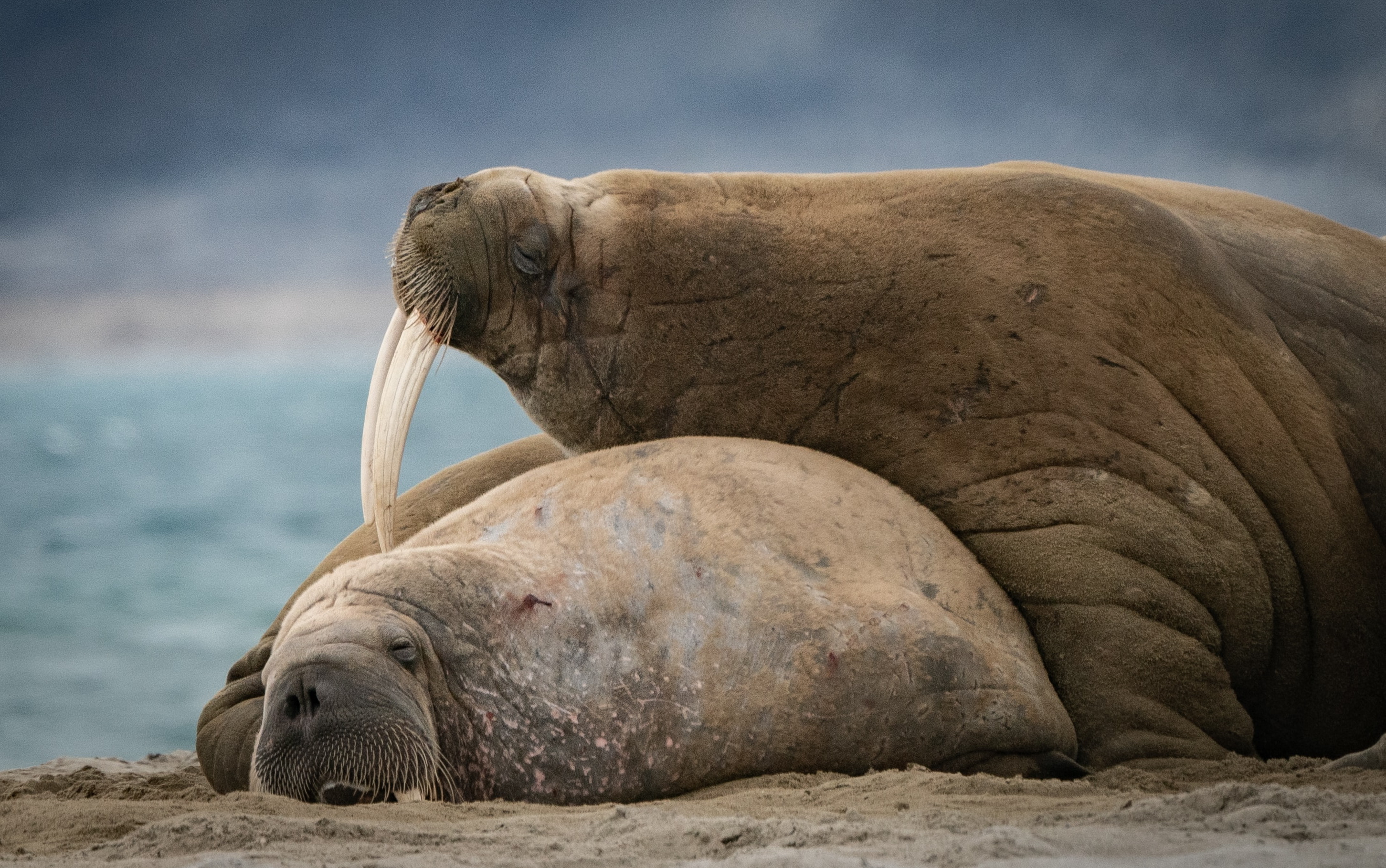 Description: A walpopotamus and a walpopo laying on the beach together with a cloudy sky in the background.
