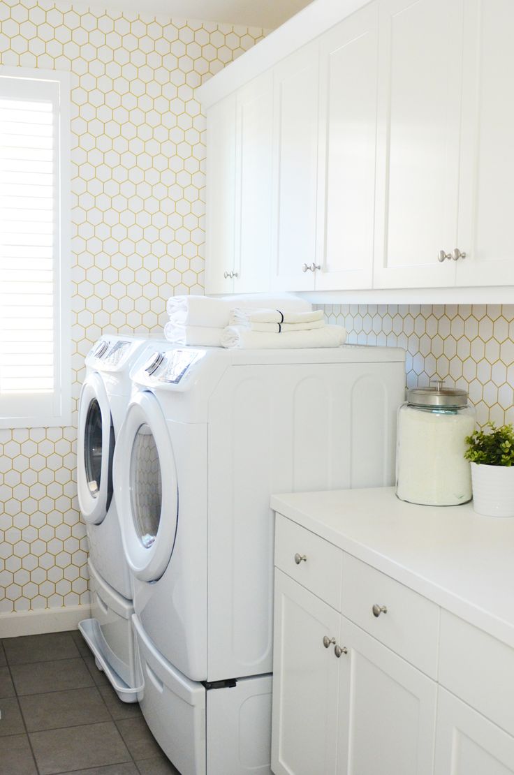 Description: A washer and dryer in a small room with a window and a tile floor and wall behind it.