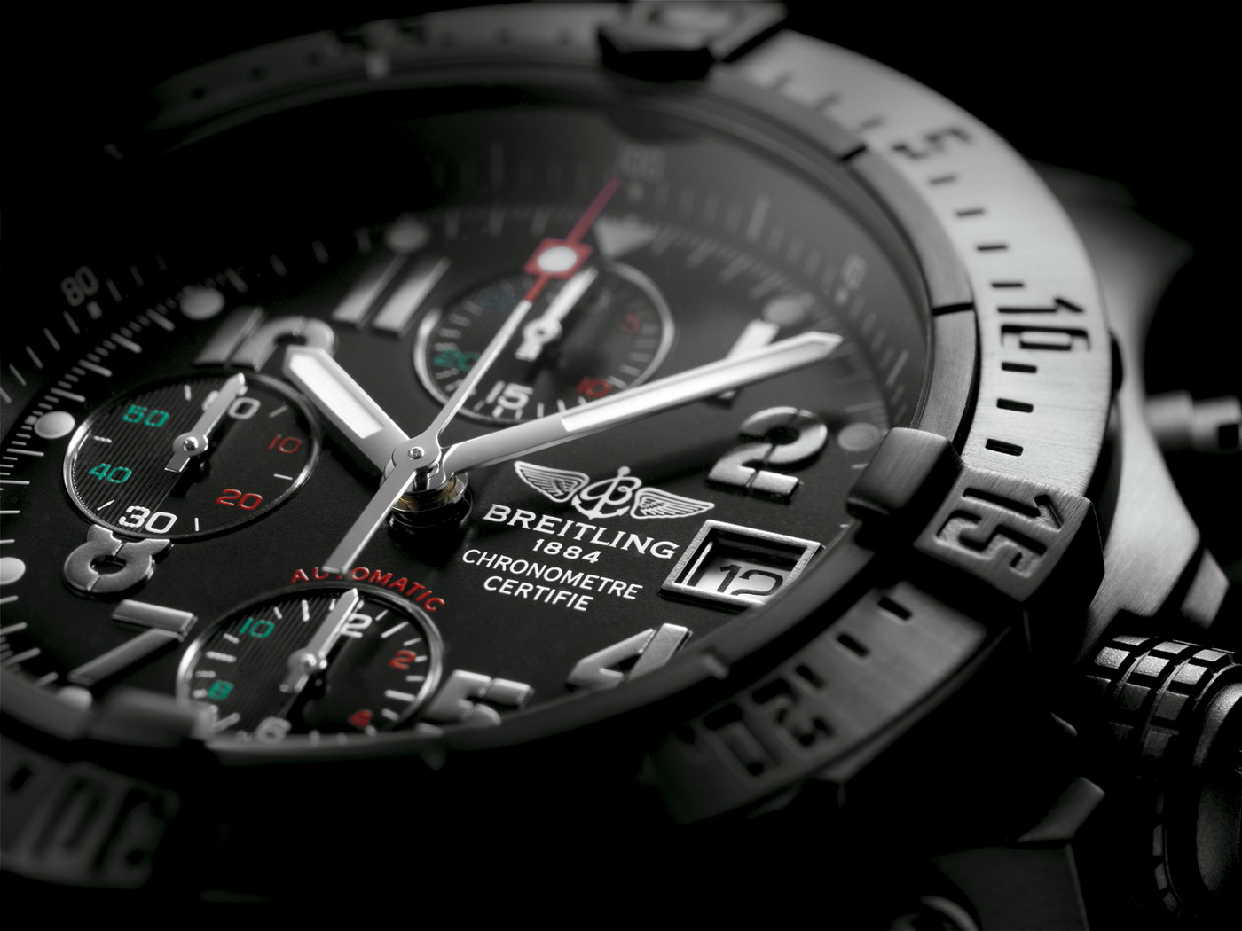 Description: A watch with a black dial and a black strap with a red second hand and a green second hand.