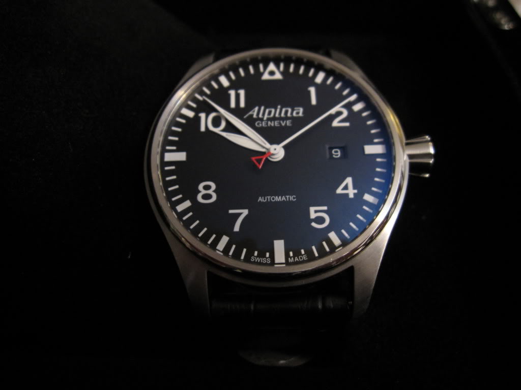 Description: A watch with a black face and a white second hand and a black leather strap with a red second hand.