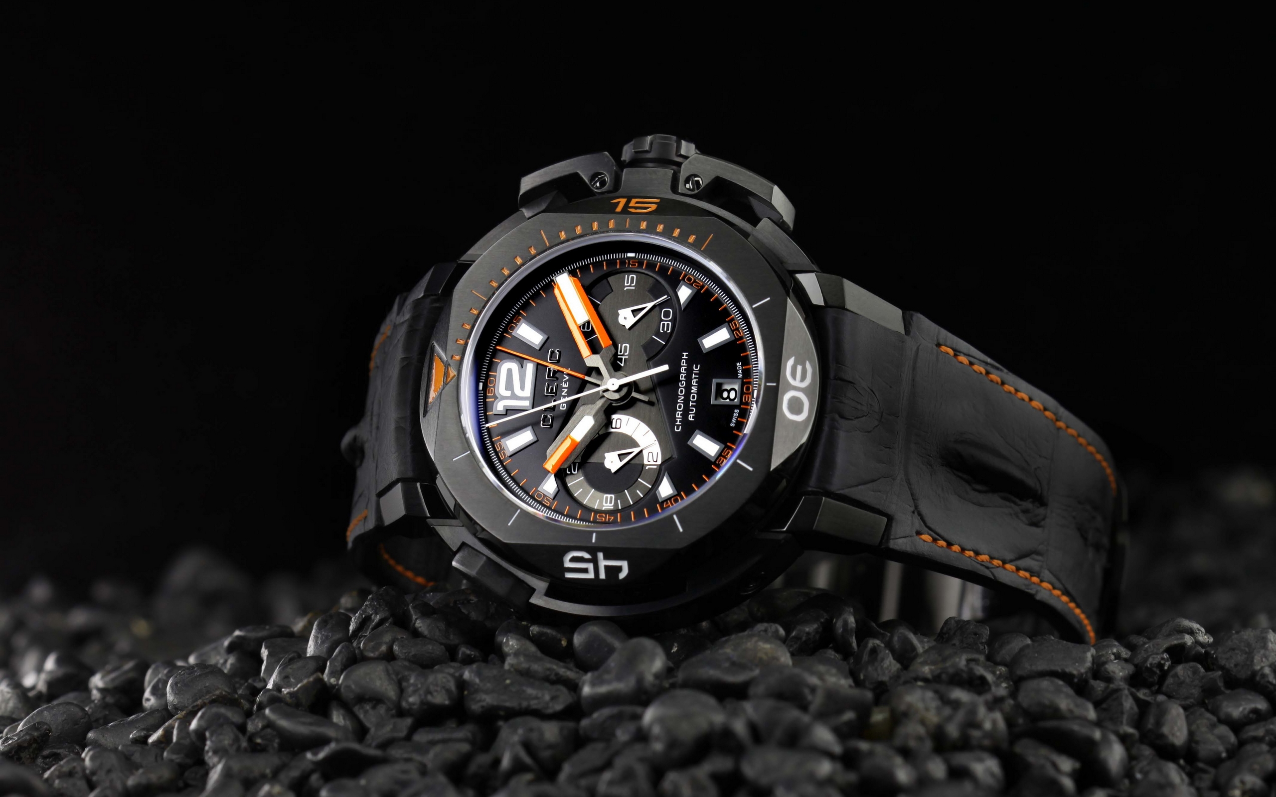 Description: A watch sitting on top of a pile of black rocks in the dark with a black background and a black strap.