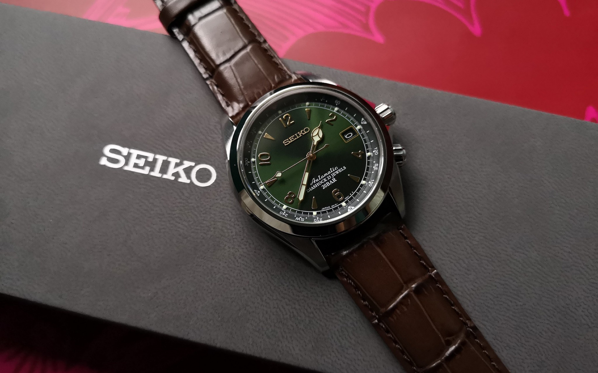 Description: A watch sitting on top of a box on a table with a red and pink background and a black watch face.