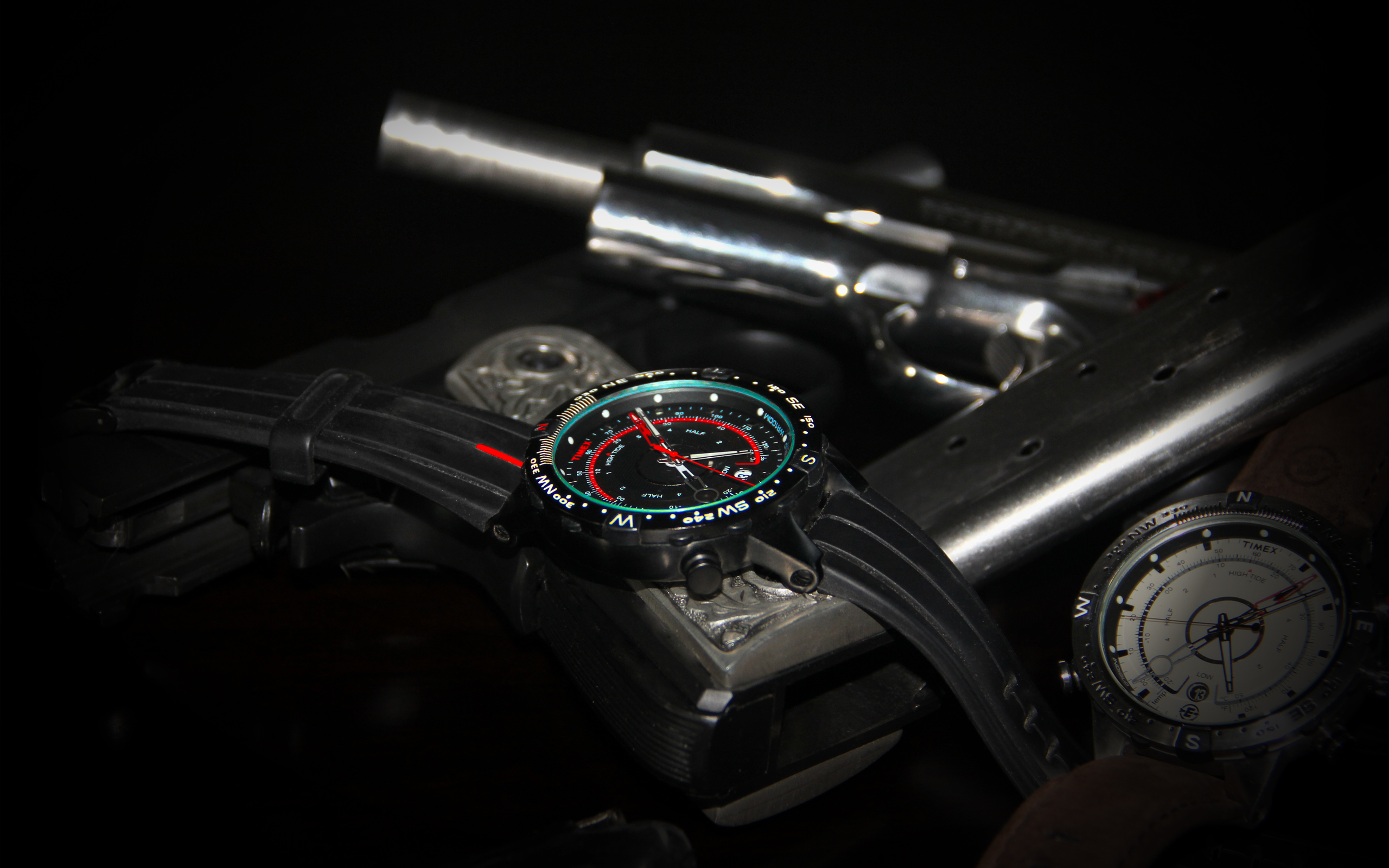Description: A watch sitting on top of a gun and a gun case with a gun in the background and a gun in the foreground.