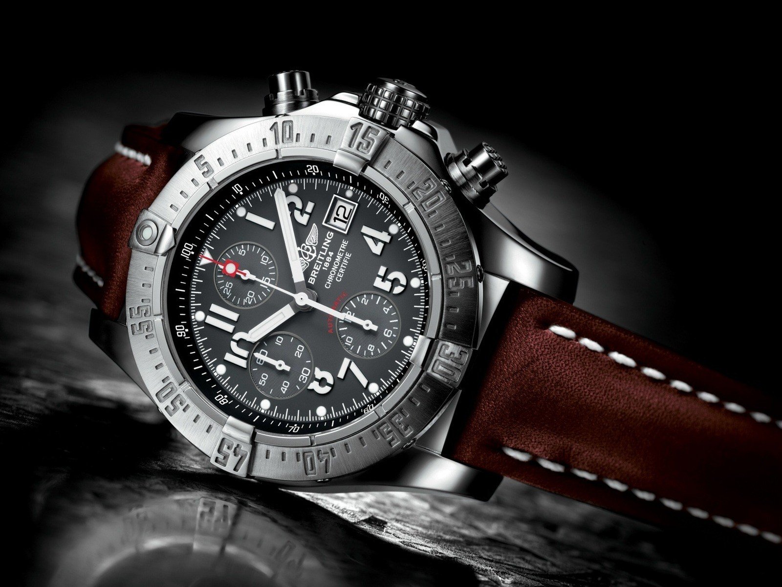 Description: A watch with a red strap on a black surface with a reflection of the watch on the table top.