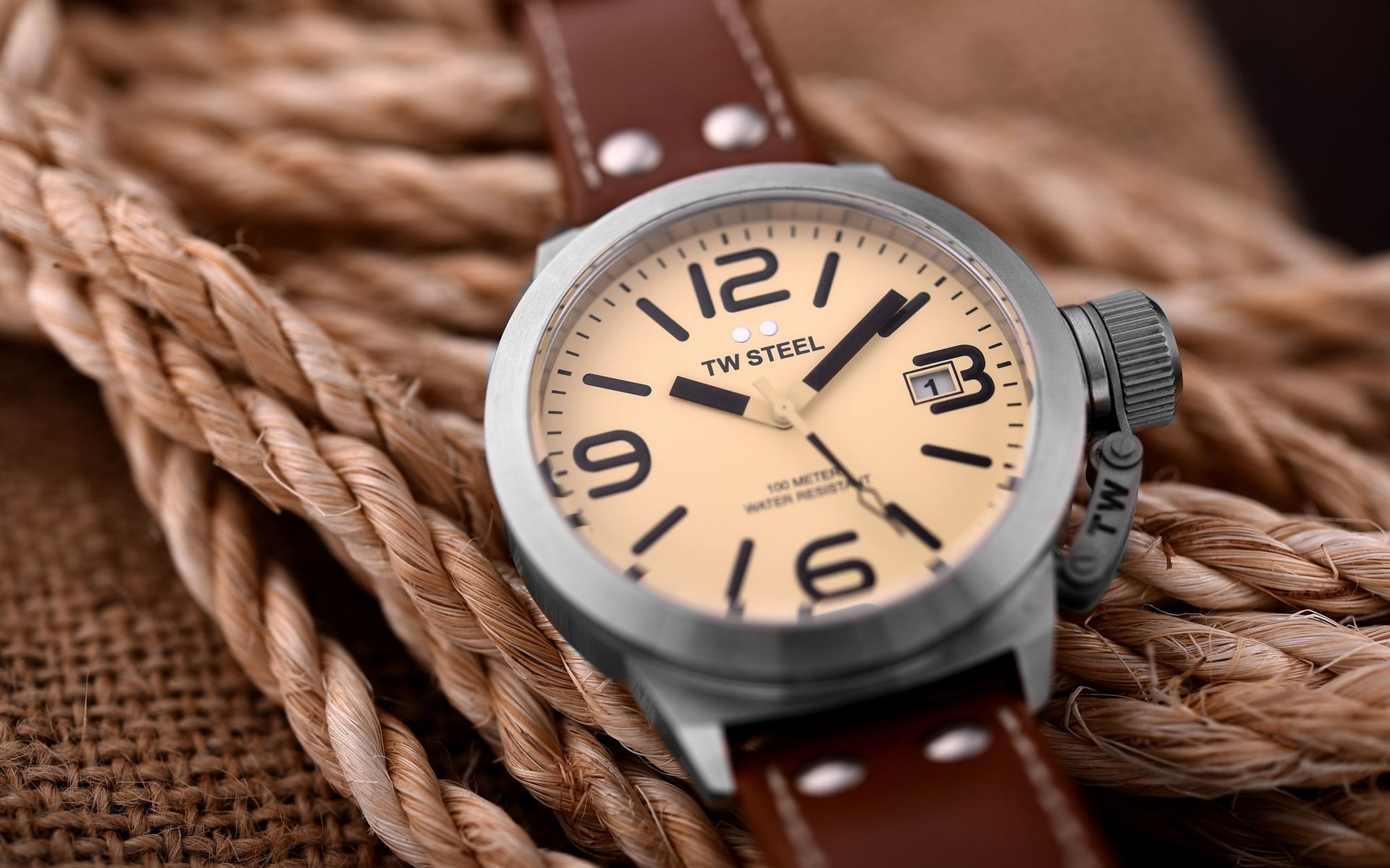 Description: A watch sitting on a rope on a brown cloth background with a brown strap around it and a black and white dial.