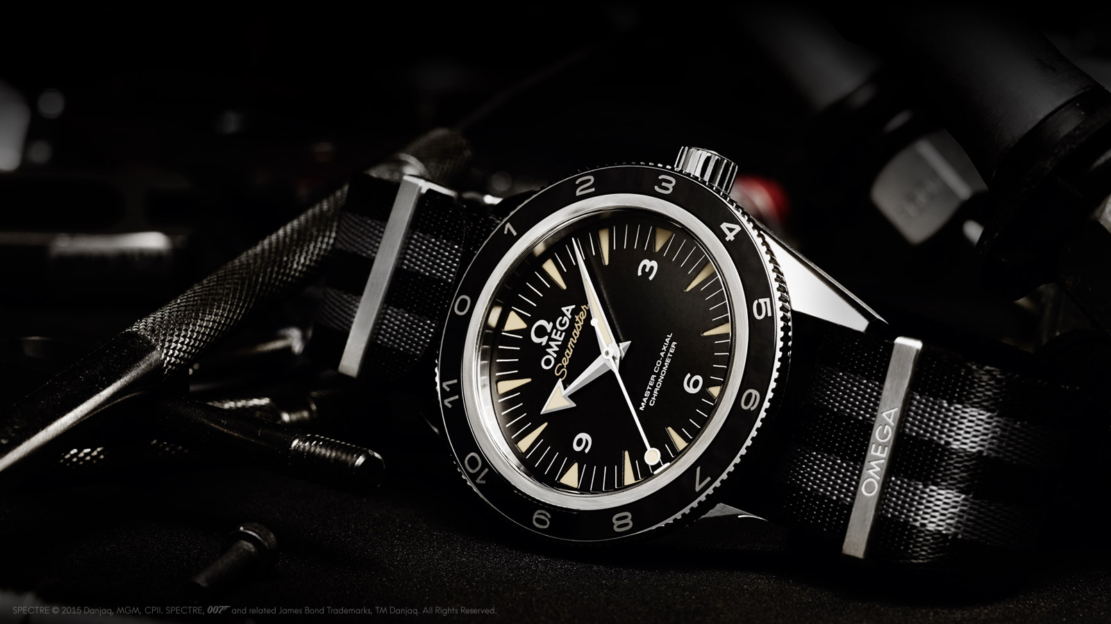 Description: A watch sitting on top of a black table next to a bottle of wine and a knife on a table.