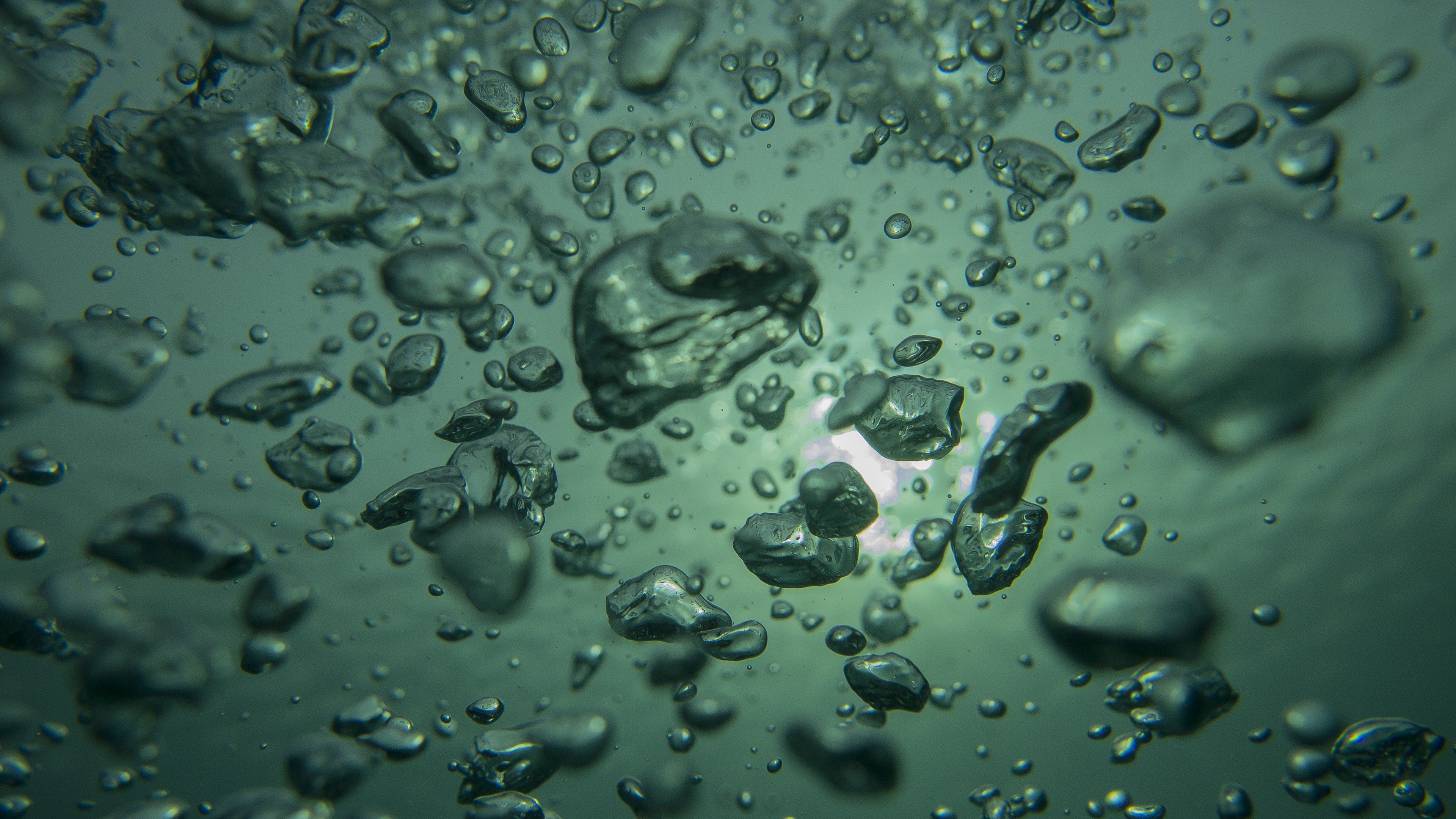 Description: A close up of water bubbles on a surface of water with a light blue background and a white spot.