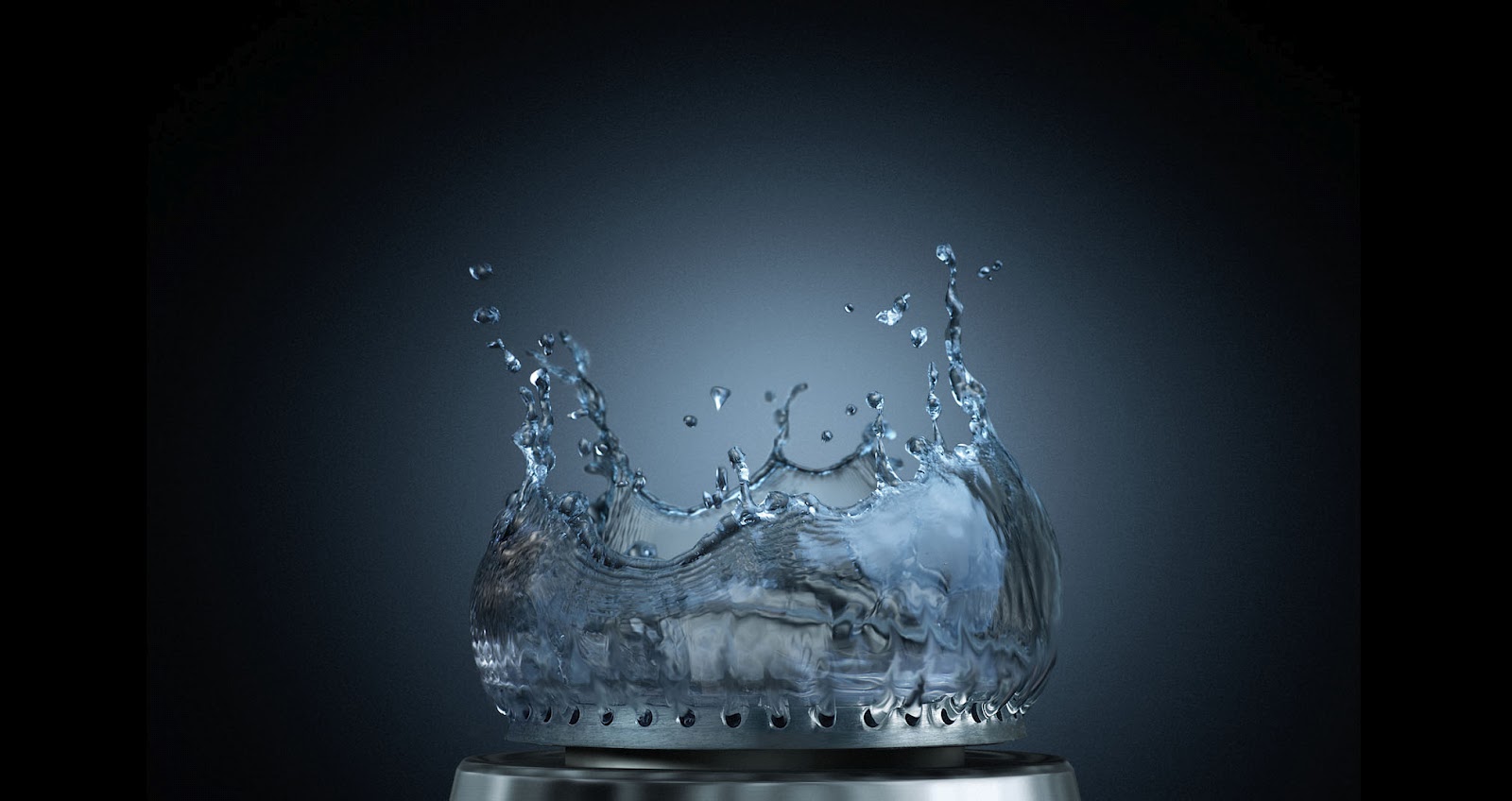 Description: A crown made of water on a table top with a black background and a reflection of the crown on the table.