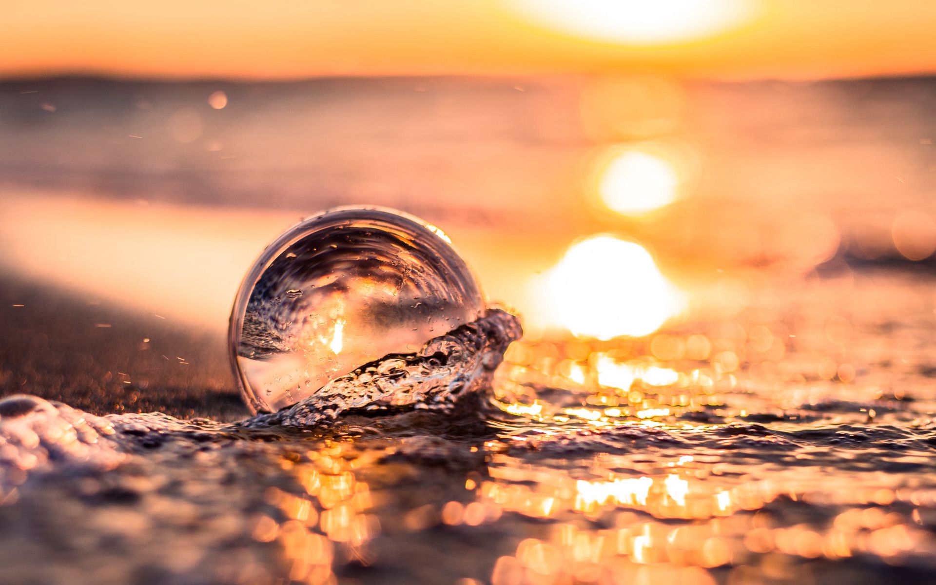 Description: A close up of a water drop on a beach at sunset or sunrise time with the sun shining through the water.