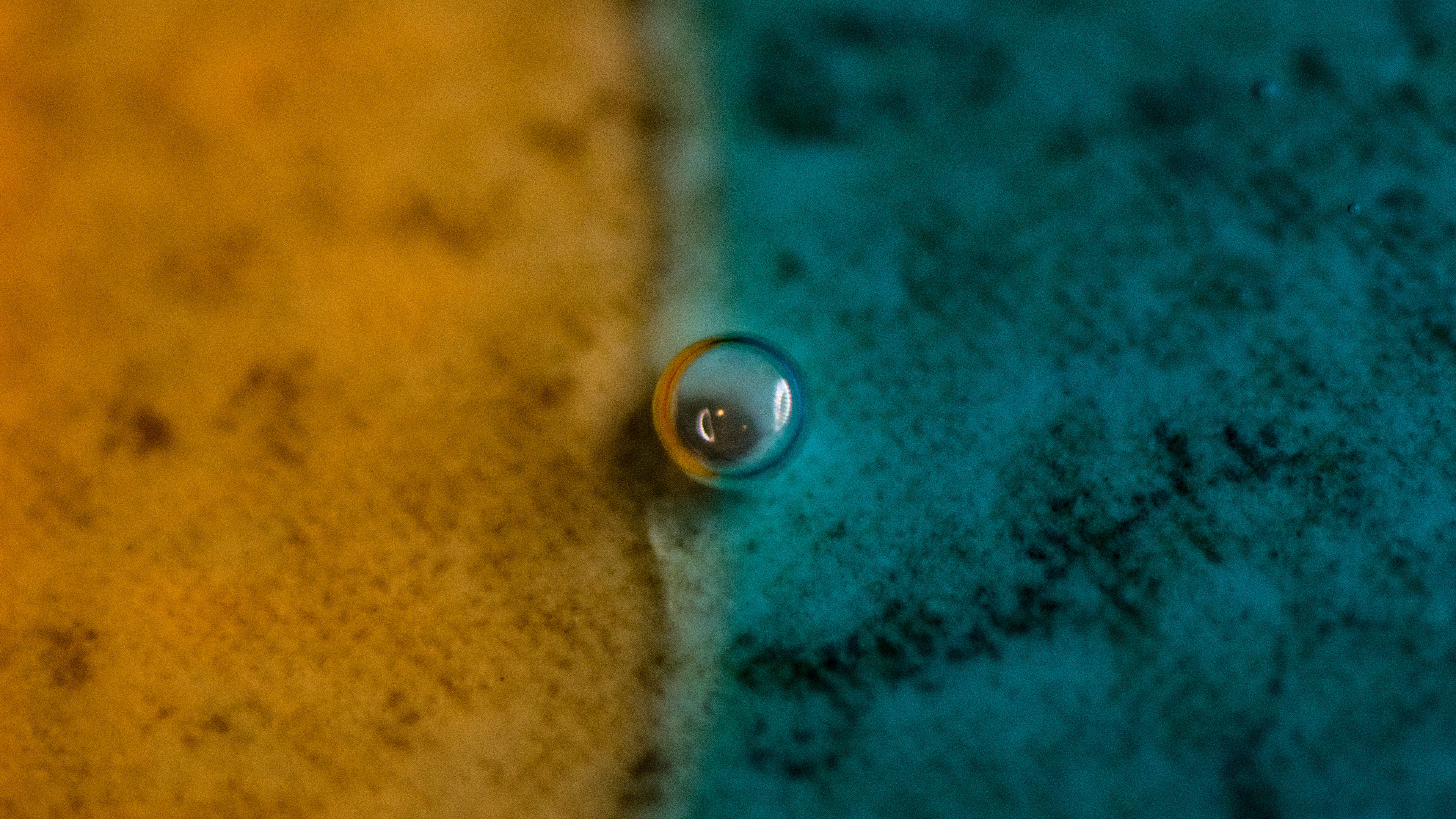 Description: A drop of water sitting on top of a blue and yellow surface with a yellow stripe in the background.