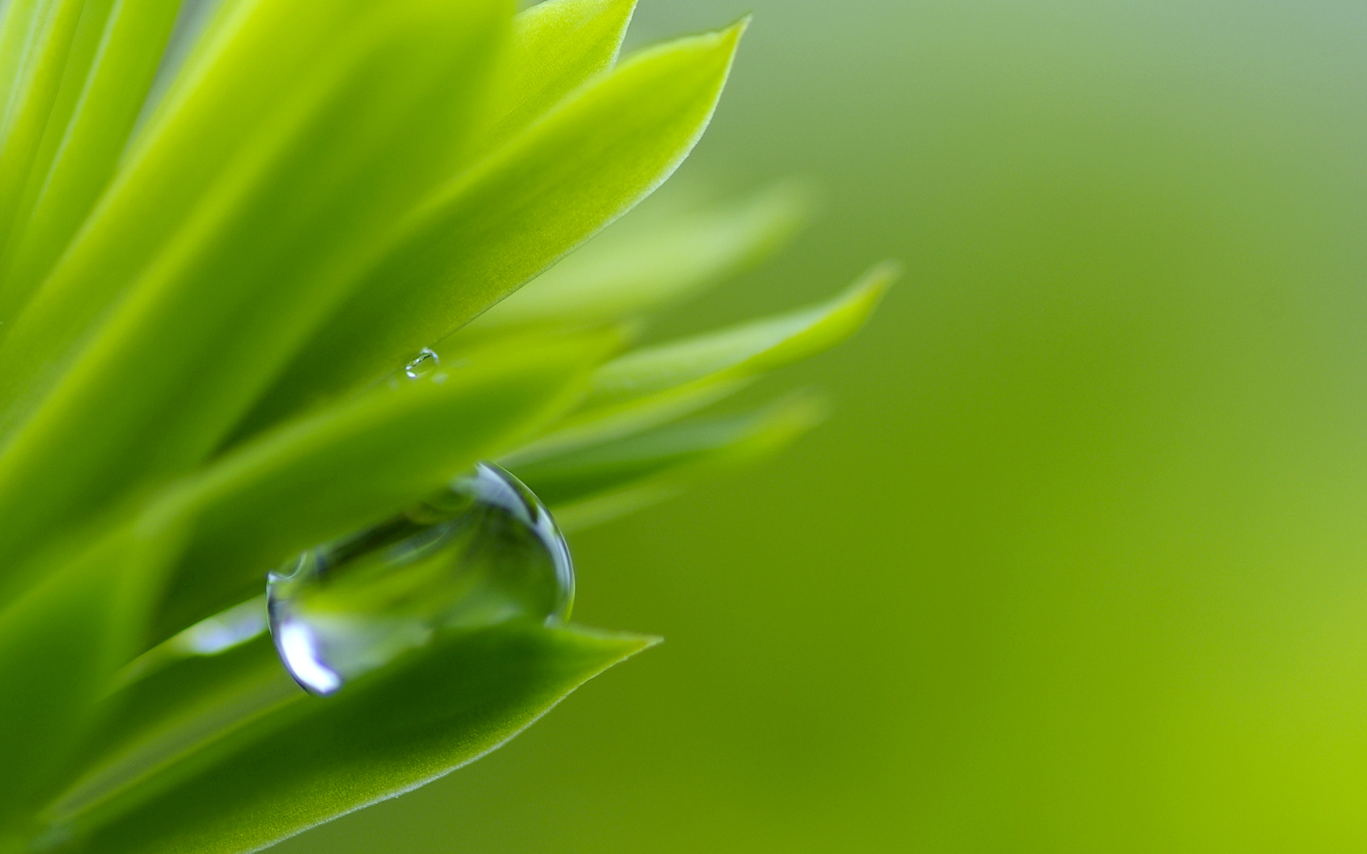 Description: A drop of water on a green leaf with a blurry background of grass and water droplets on the leaves.