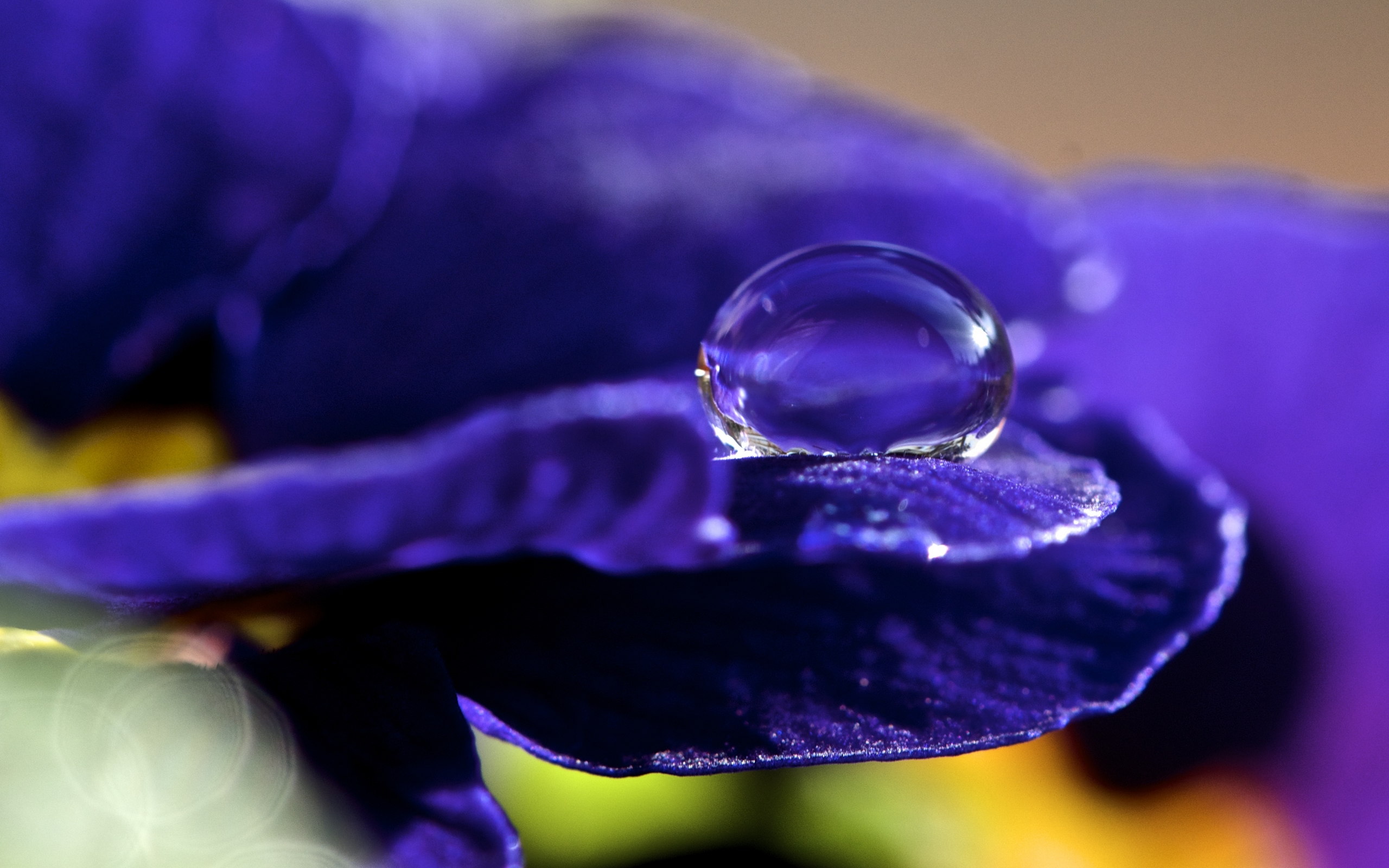 Description: A drop of water sitting on top of a purple flower with a green stem in the background and a blurry image of a purple flower.
