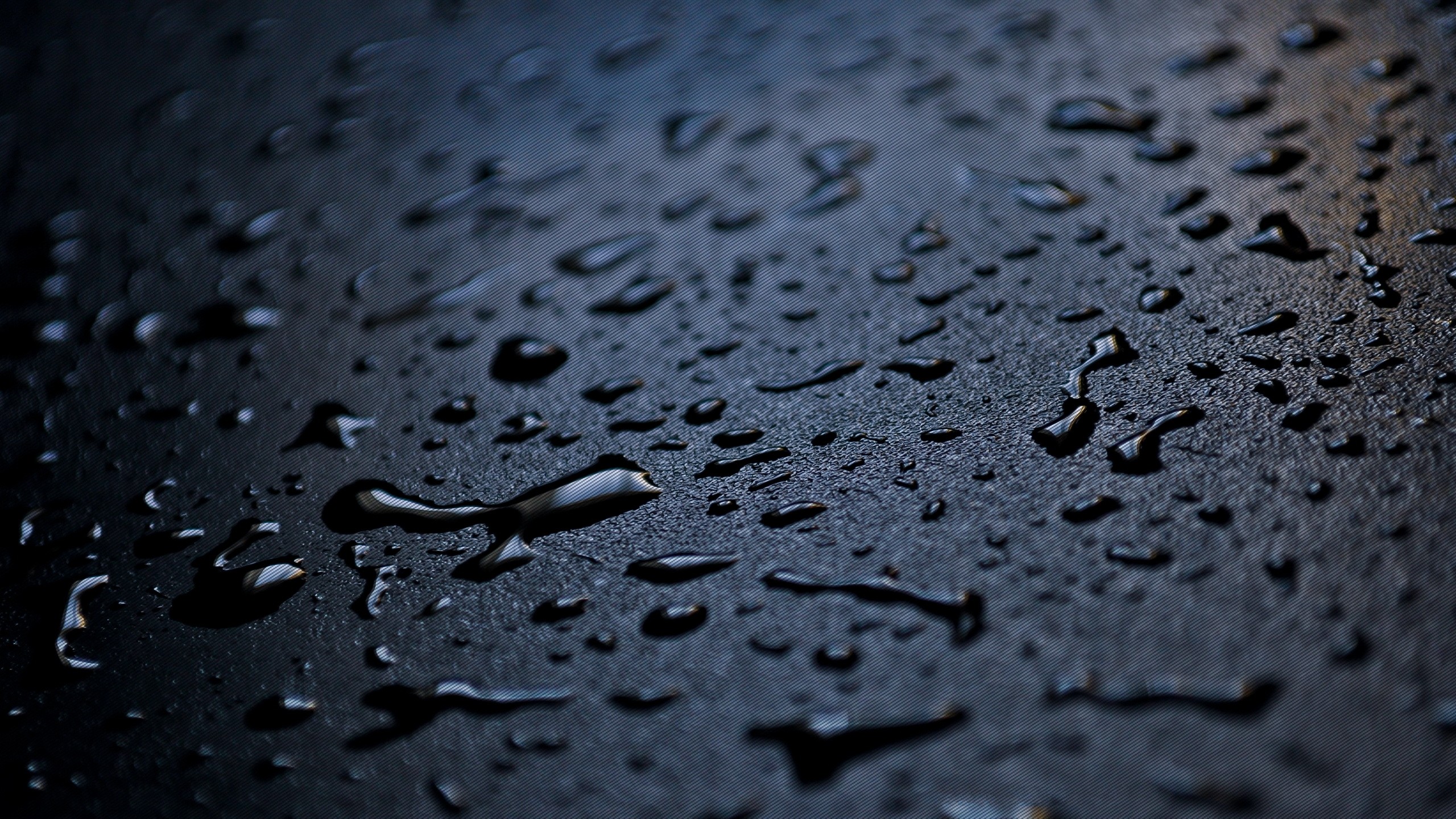 Description: A close up of water droplets on a black surface with a dark background and a few drops of water.