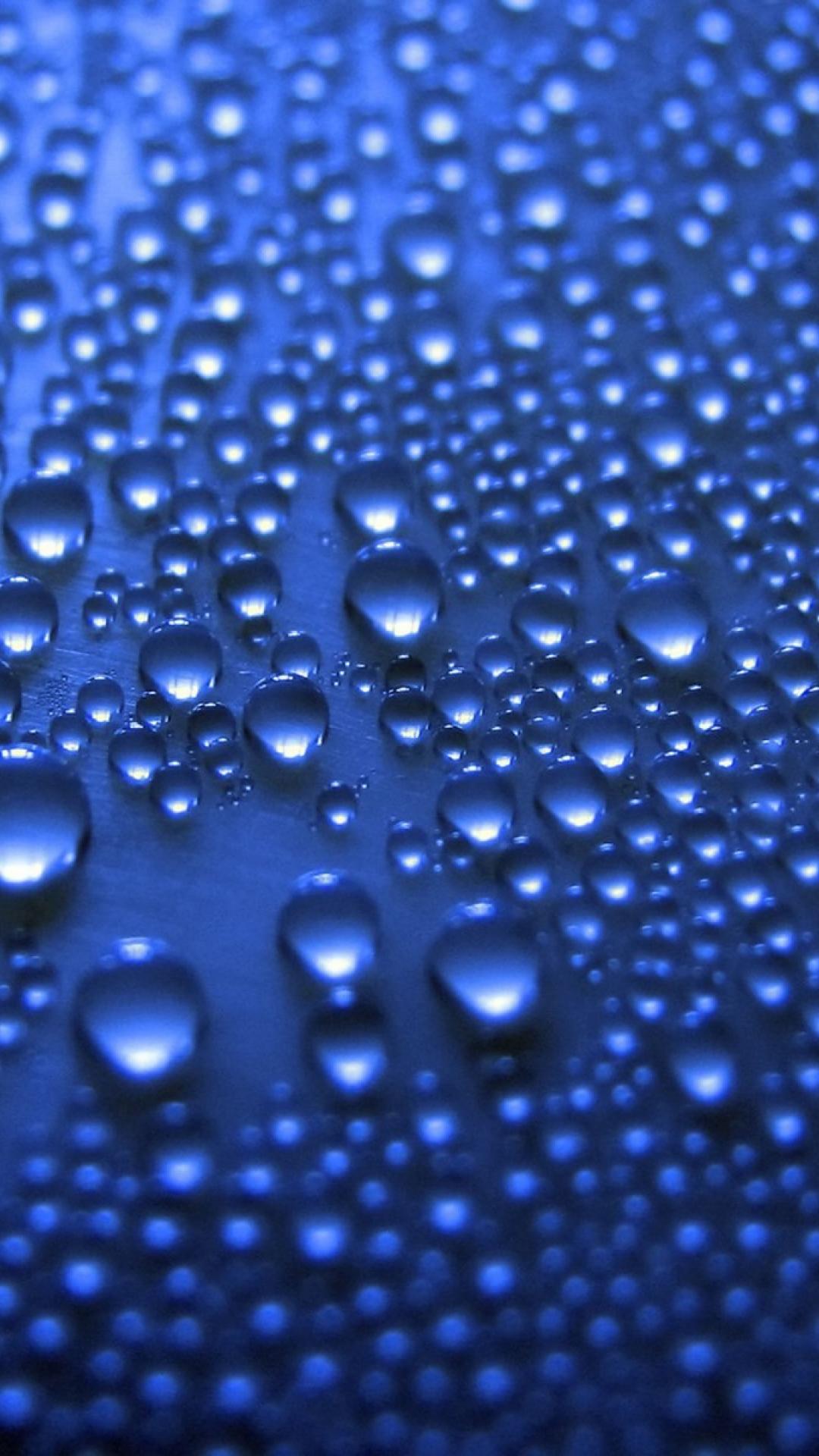 Description: A close up of water droplets on a blue surface with a black background and a blue background with a black border.