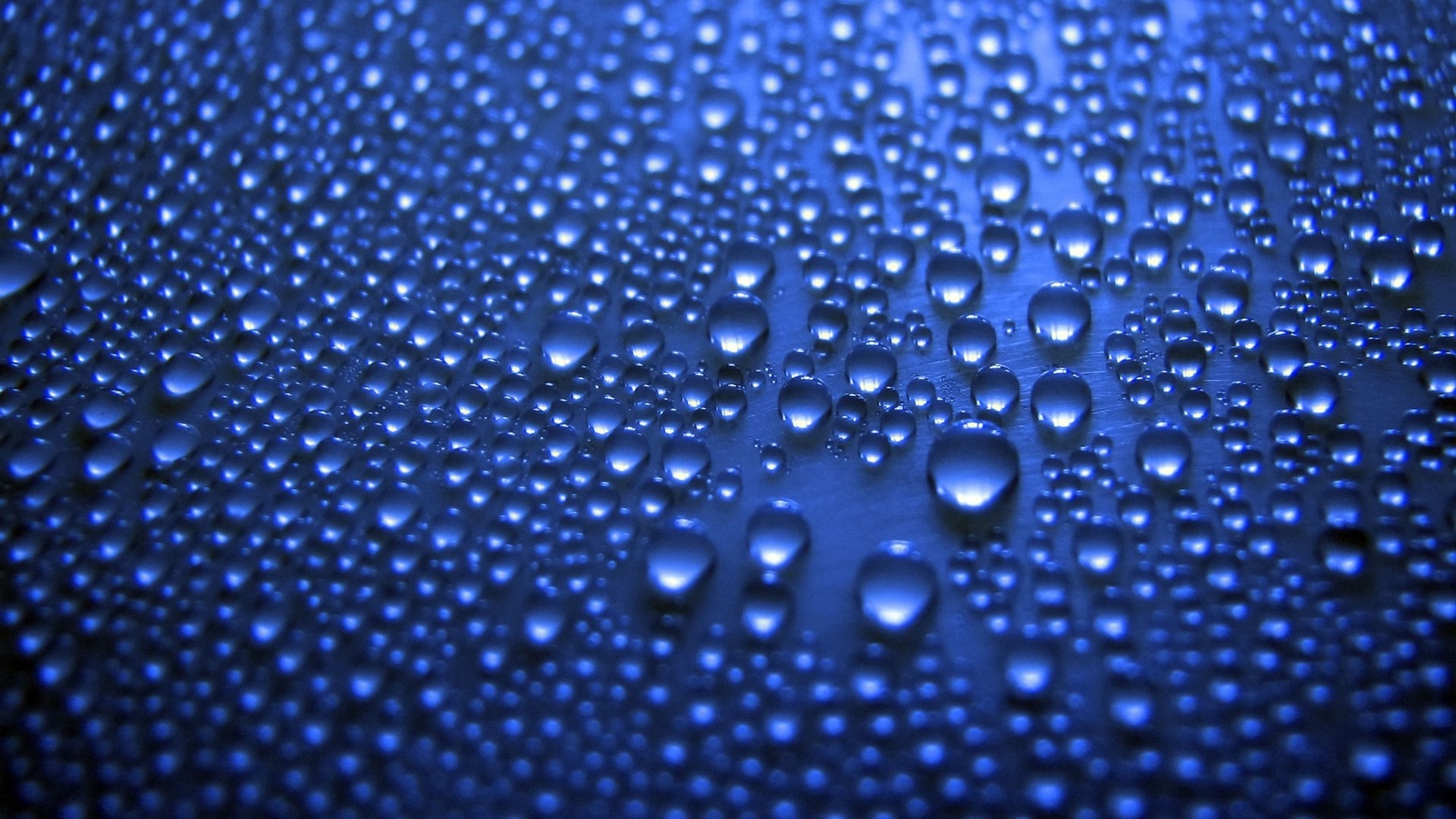 Description: A close up of water droplets on a blue surface with a black background and a blue sky in the background.