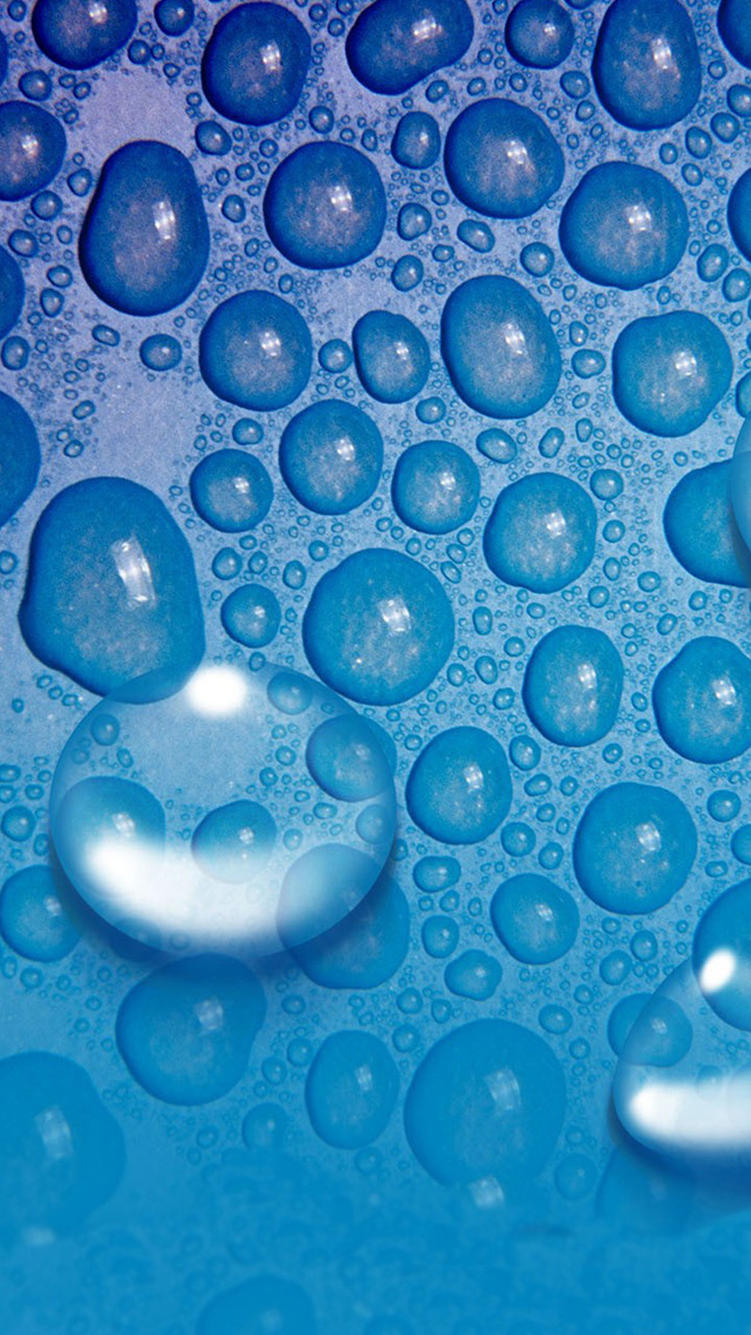 Description: A close up of water droplets on a blue surface with a blue background and a white border with a blue border.